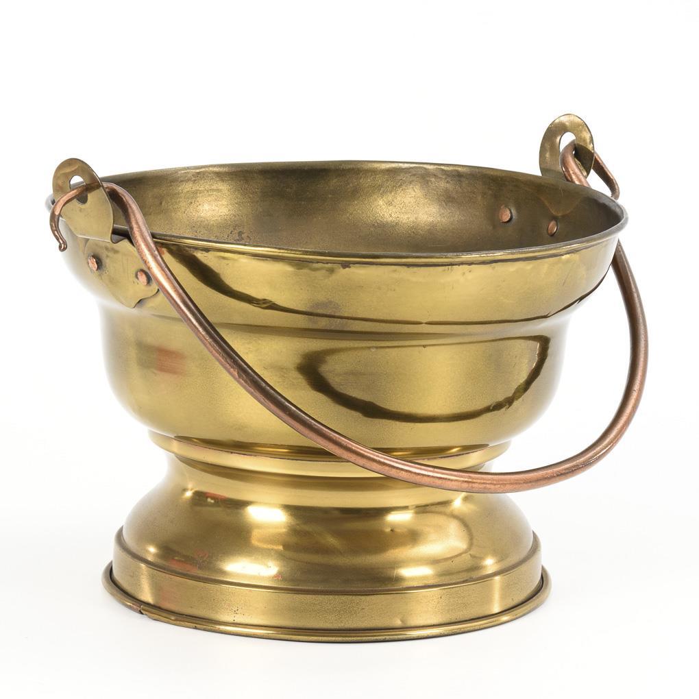 Brass with flanged lip, remains of copper plating, copper bail. H 20 cm, Ø 30 cm (each without stirrup lugs).