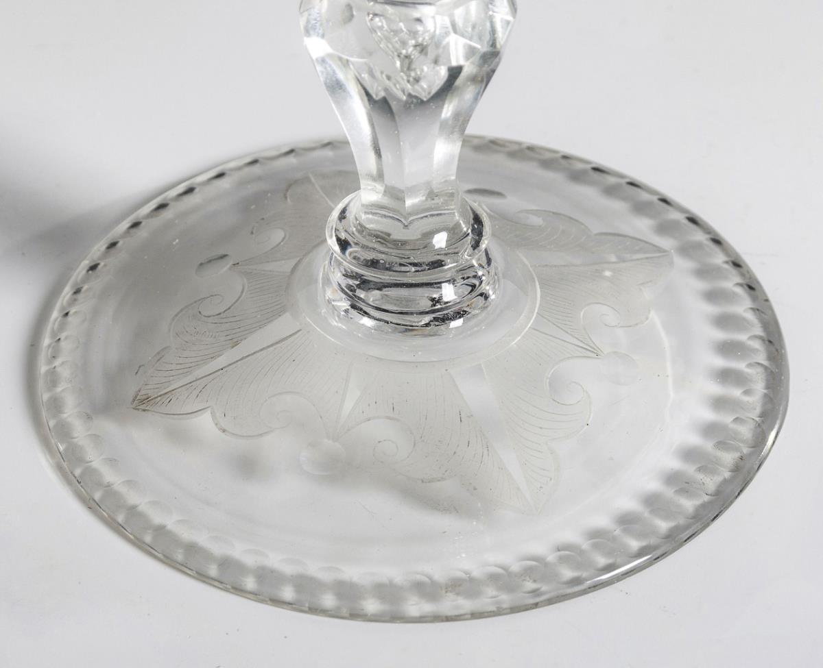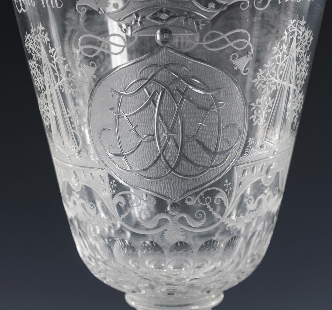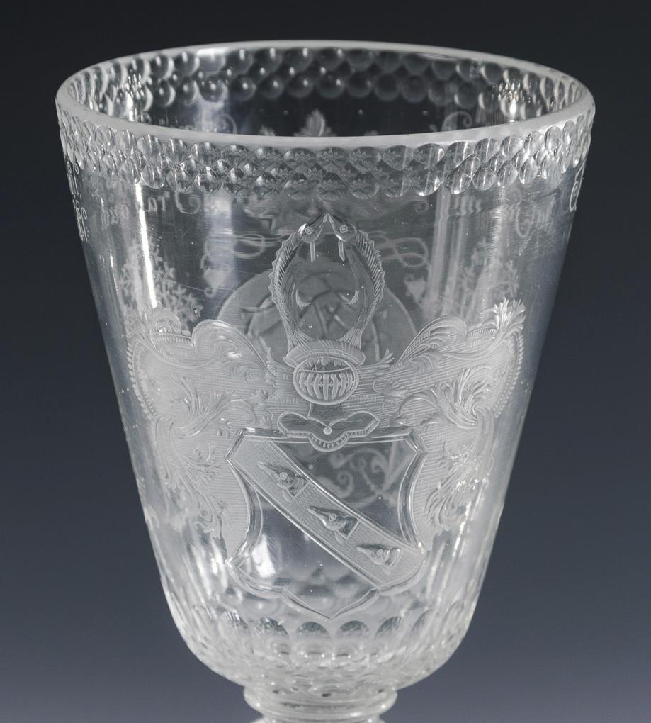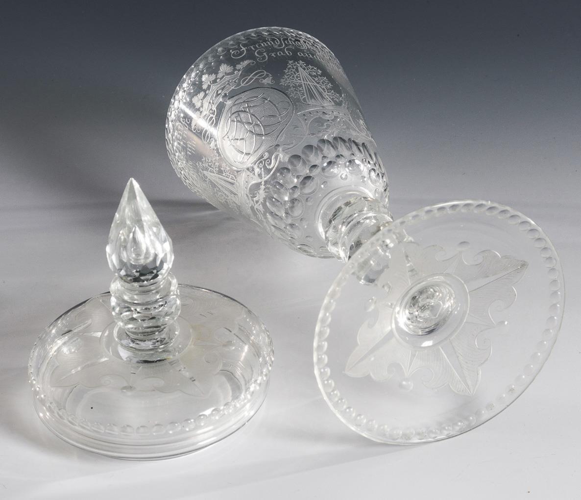 Tapered dome, pommel lid with pierced bubble, faceted baluster stem with pierced bubble, round base; demolition. On the front between lentil and olive cut borders the engraved coat of arms of the noble family of Zanthier, verso the ligatured monogram "OFZ" flanked by commemorative stones. Small chip at the foot.