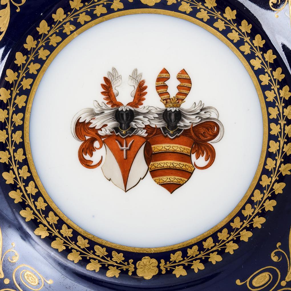 Plate with gold engraved ornamental painting on the cobalt blue flag, in the mirror the representation of the coat of arms of the family von der Gabelentz as well as the family of Linsingen.