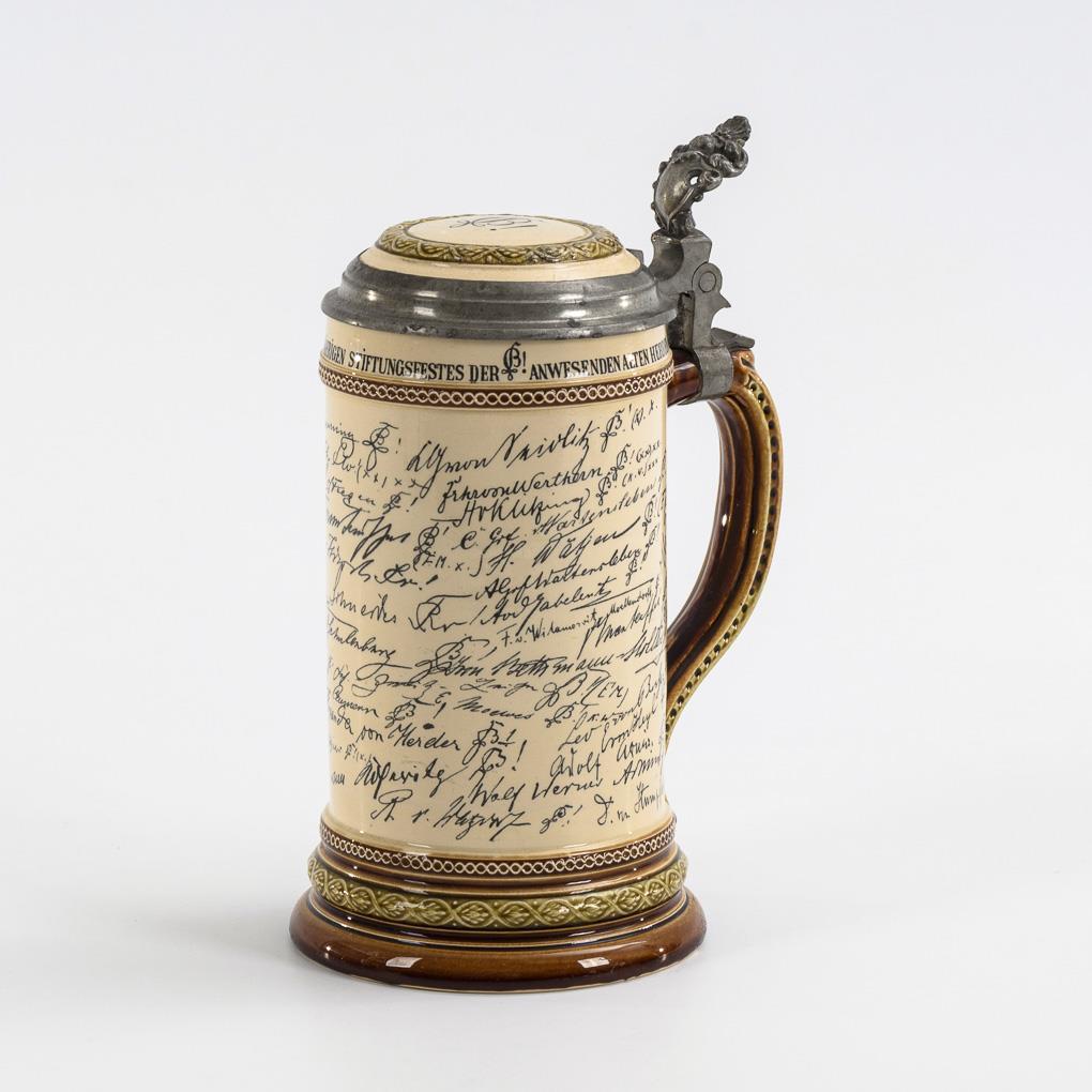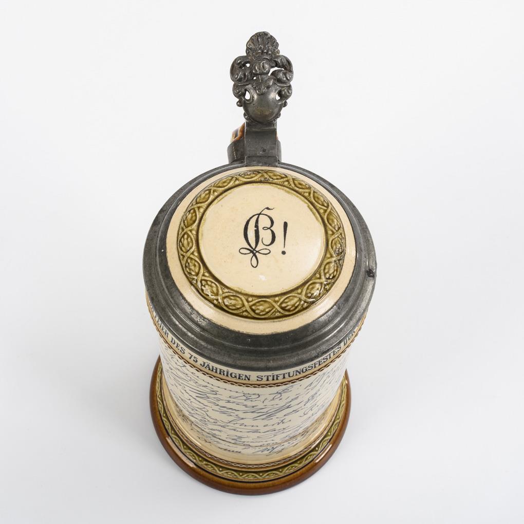 Rare mug from the foundation festival of the Corps Saxo-Borussia Heidelberg 1895 with signatures. Mettlach.