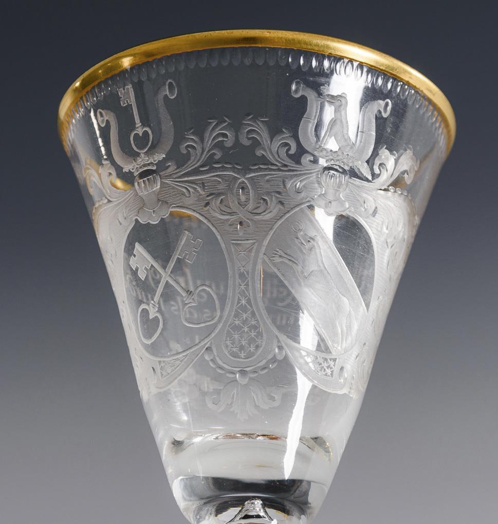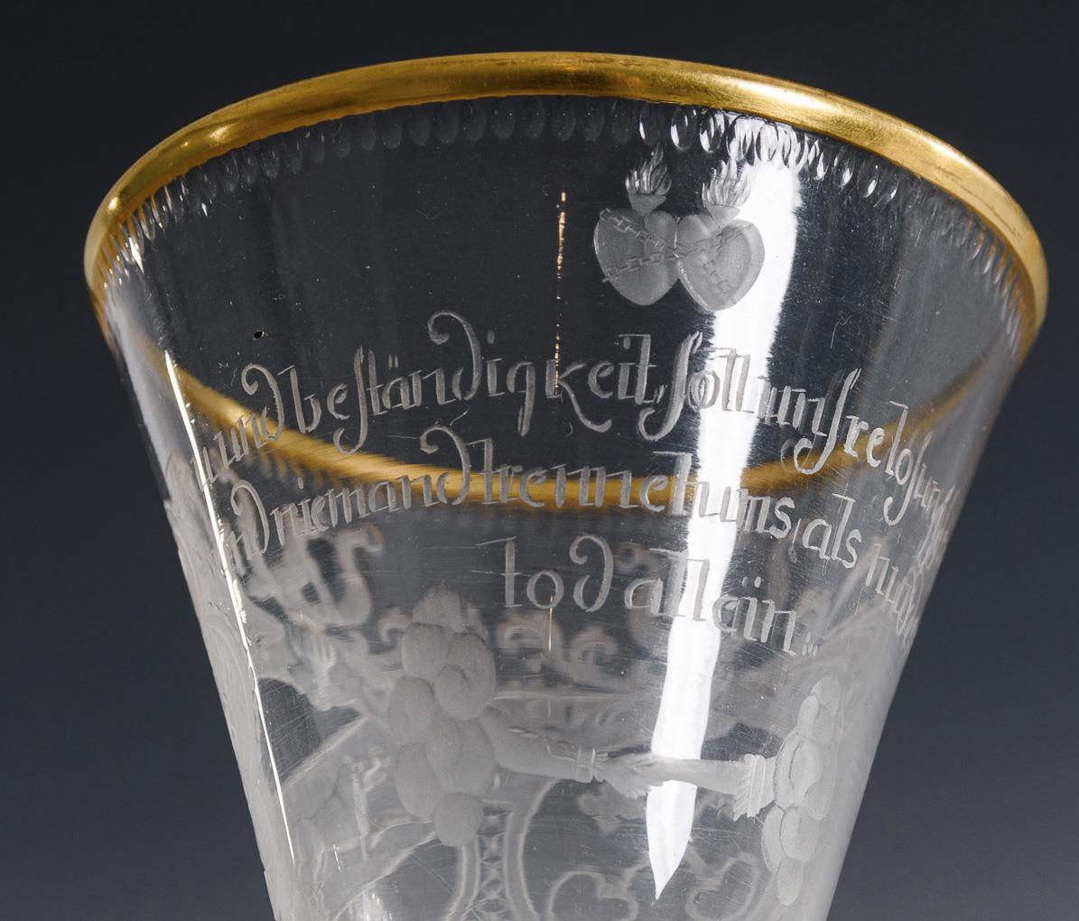 Tapered dome, baluster stem with pierced air bubble, old supplemented wooden base. On the dome under an olive cut border the engraved representation of an alliance coat of arms with crossed keys and a running fox, verso between two flaming hearts and two hands rising from clouds and grasping each other the saying "Treu und beständigkeit soll unsre losung seyn / und niemand trennet uns als nur der / tod allein"..