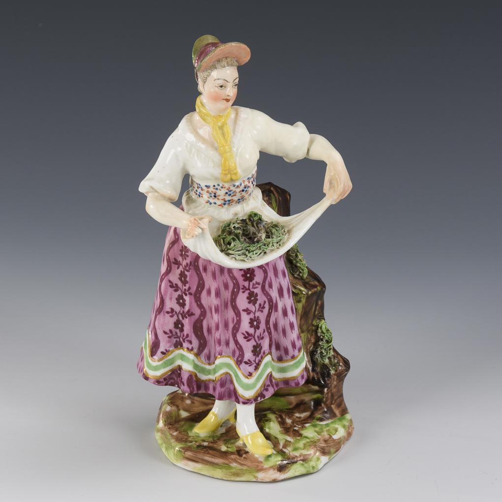 Woman standing by a tree trunk, carrying in her apron a bird's nest with young birds. Left arm and hat restored, "grass" bumped.