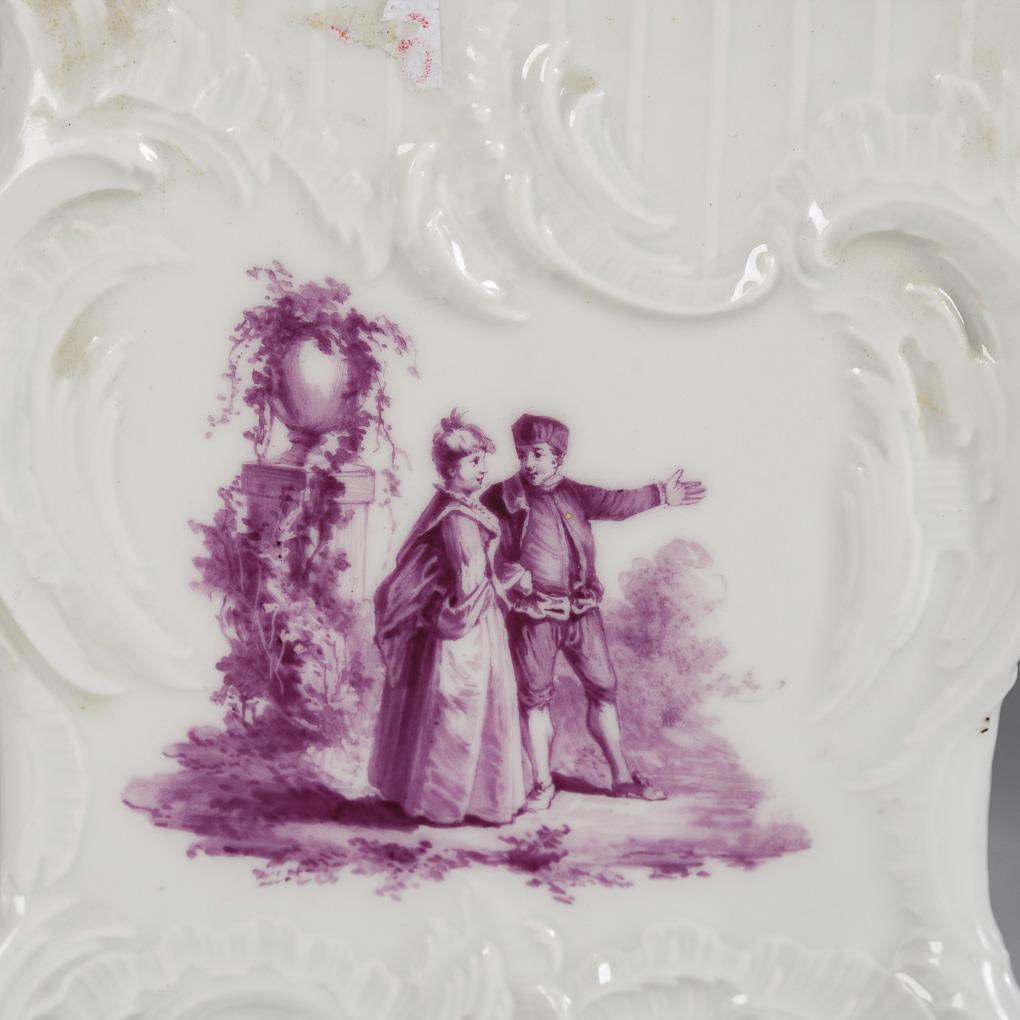 Square box with rocaille and trellis relief, two handles and flower knob lid. With purple painted Watteau scenes and floral festoons. Flower knob bumped and restored at the base, restoration at the edge of the lid.