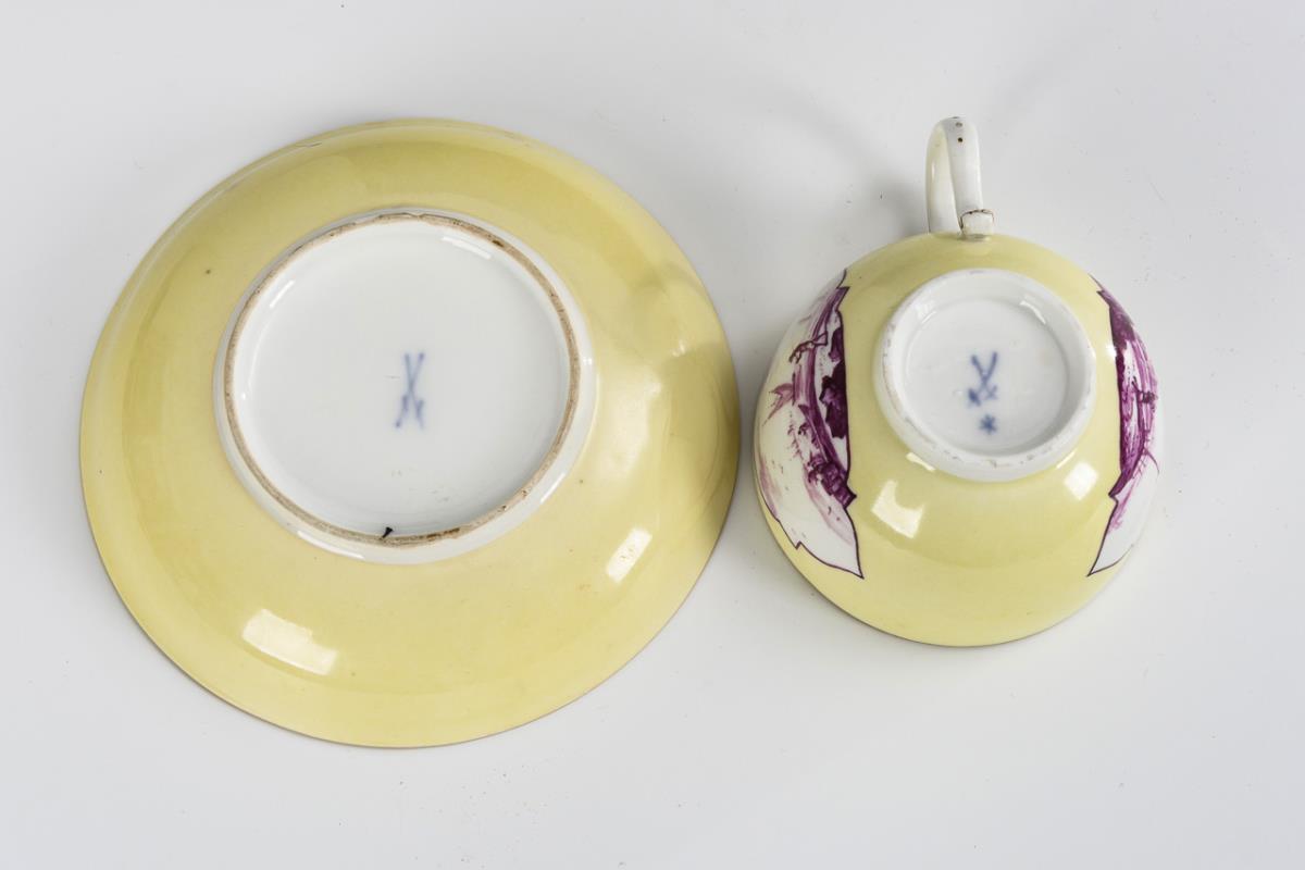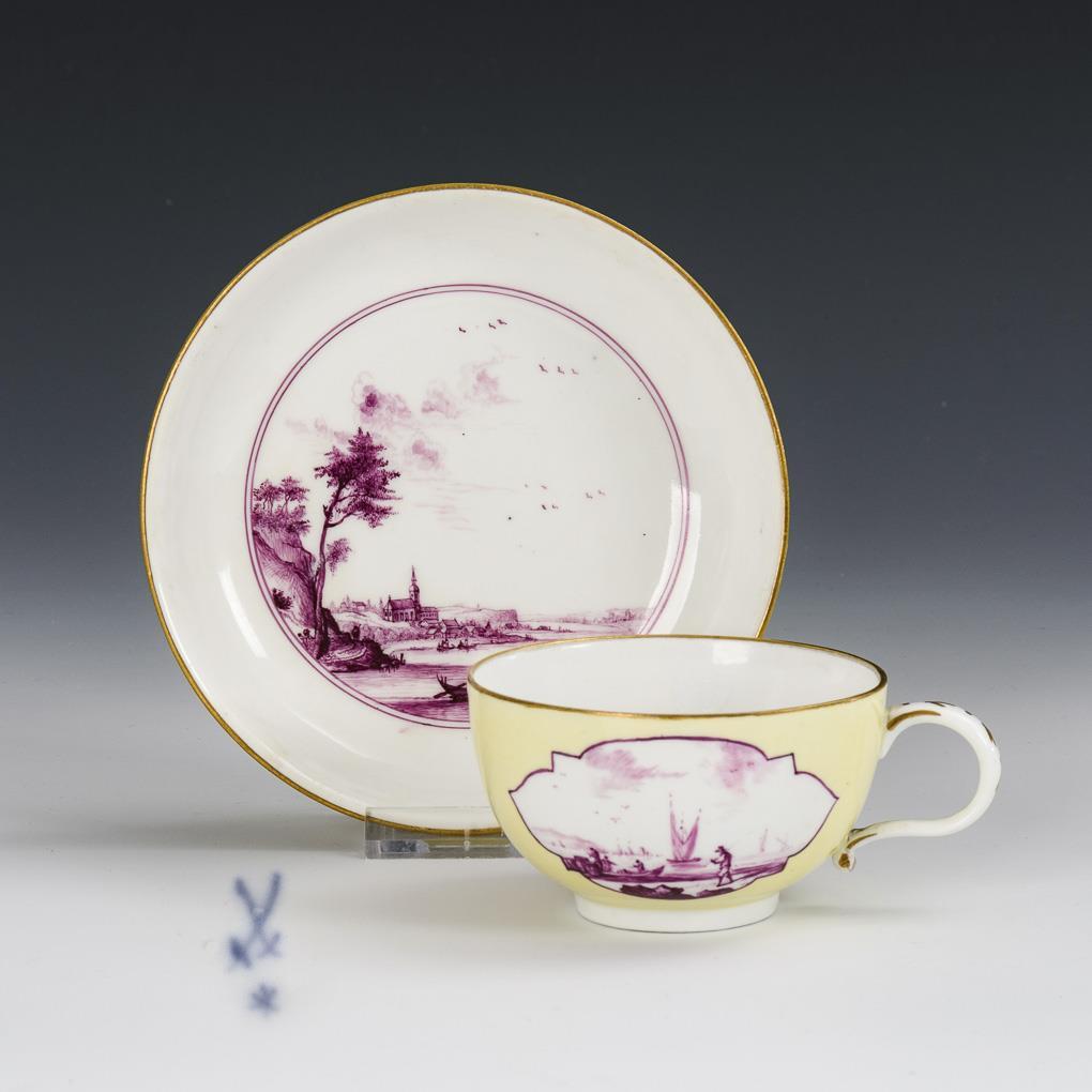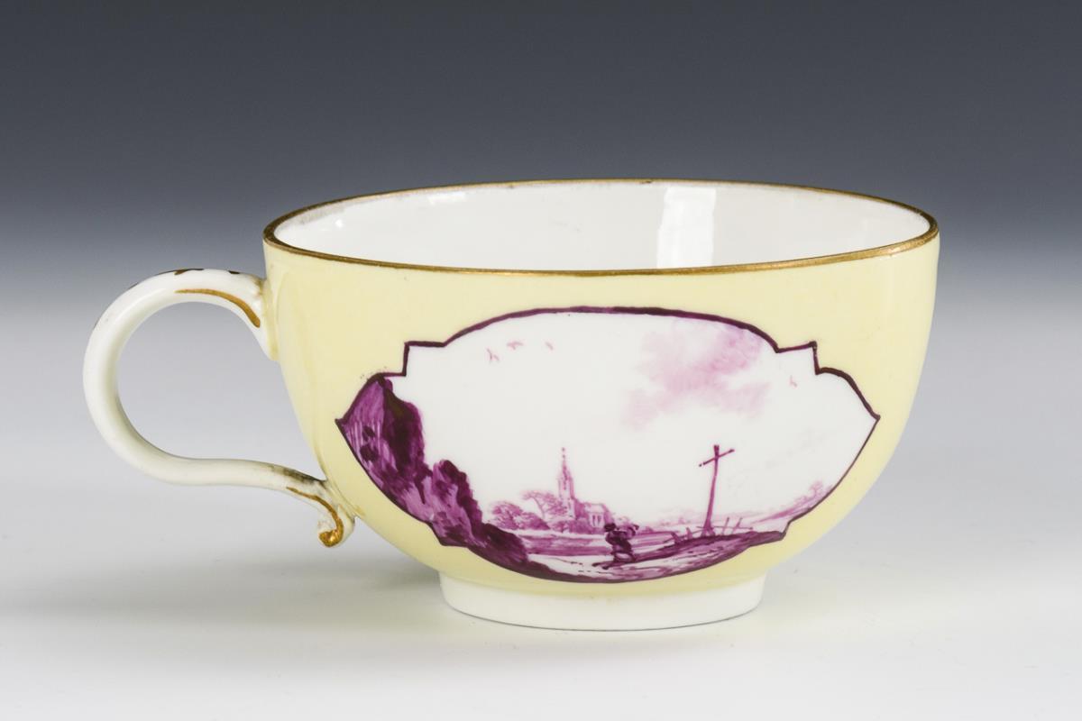 Bellied cup with ear handle. Light yellow background, in two cartouches and in the mirror of the saucer small landscape views and a merchant ice scene. Small hairline crack at the base of the handle.