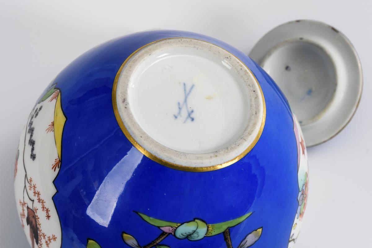 Bellied jug with branch handle, branch finial and flower knob lid. Blue background with floral and bird painting and a cartouche on both sides with floral and bird painting. Pommel and snipe restored.