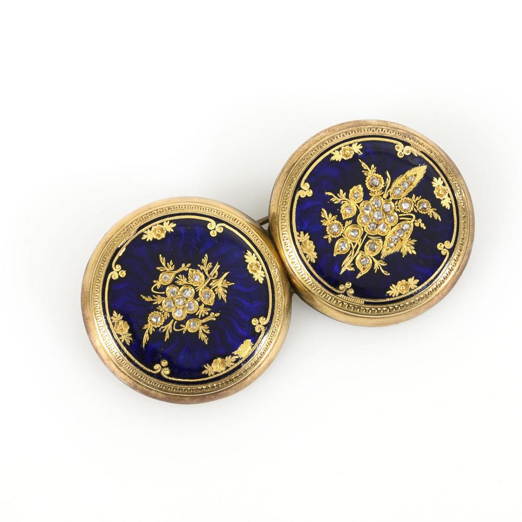 Brooch designed from antique clock case with small diamond roses in floral engravings between blue enamel. Ball hook.