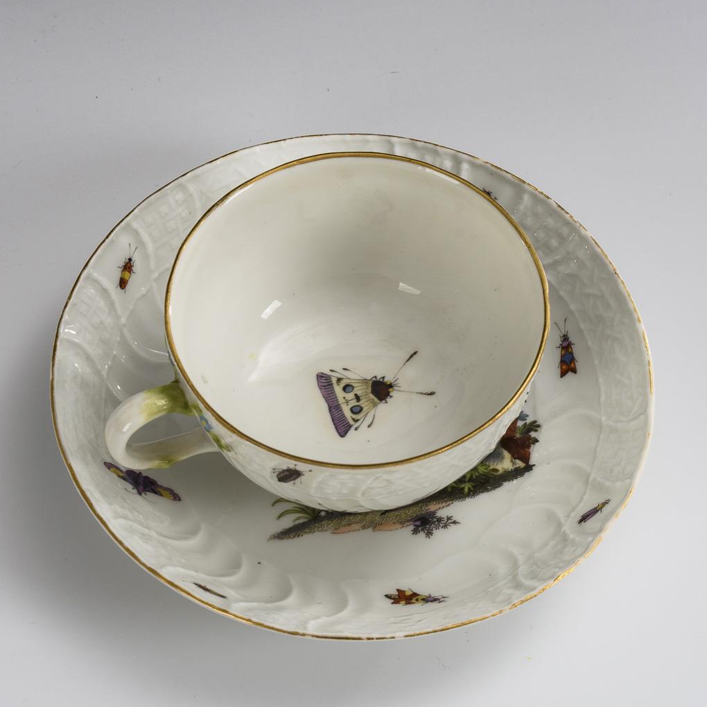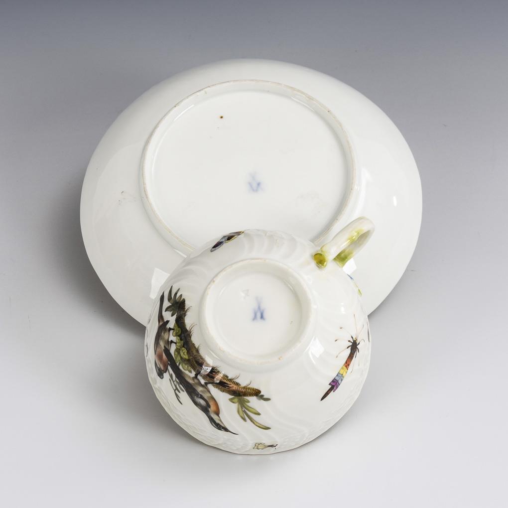 Form "Neubrandenstein". Bellied cup with branch handle. On cup and saucer the depiction of small landscape islands with birds surrounded by insects. Restoration on the rim of the cup.