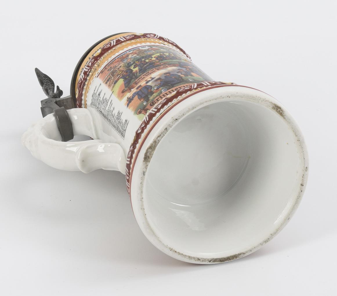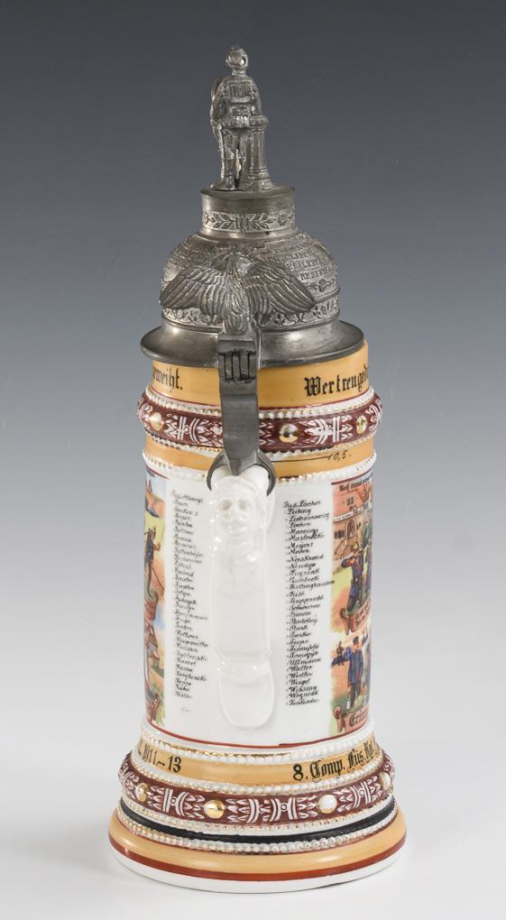 Profiled jug with soldier relief bust on the handle and decorated pewter lid with recruit (magnifying glass miniature in the head) and eagle pusher. Wall with portraits (Kaiser Wilhelm II and Karl Anton), Leopold's Barracks II, soldier scenes, aphorisms as well as list of names. "Reservist Lautenberg. 8th Comp. Füs. Rgt. Prince Karl Anton of Hohenzoll. No. 40 Rastatt." . Mounting at the handle loose, somewhat rubbed, miniature without picture.