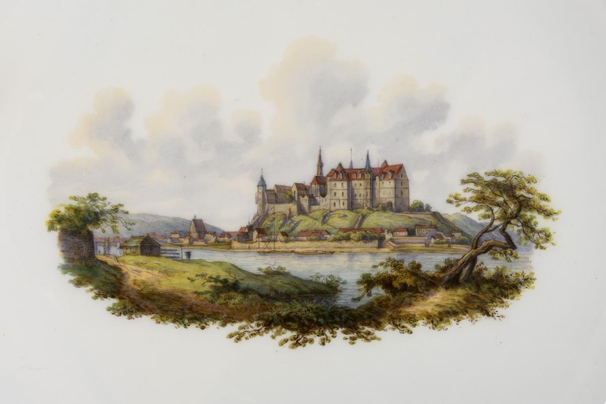 Dish with gold-bronzed leaf relief. In the mirror the view of the Albrechtsburg in Meissen. Gold partly rubbed, 1 edge restoration.