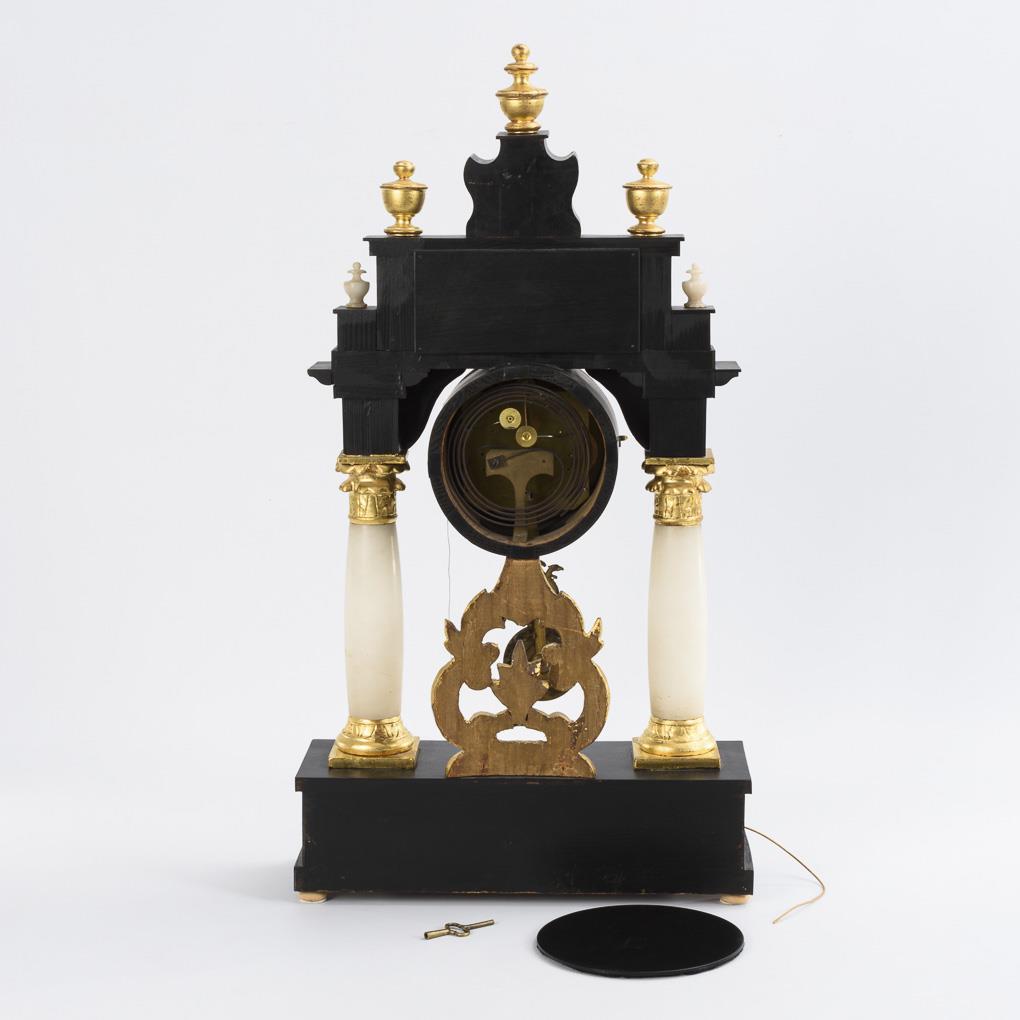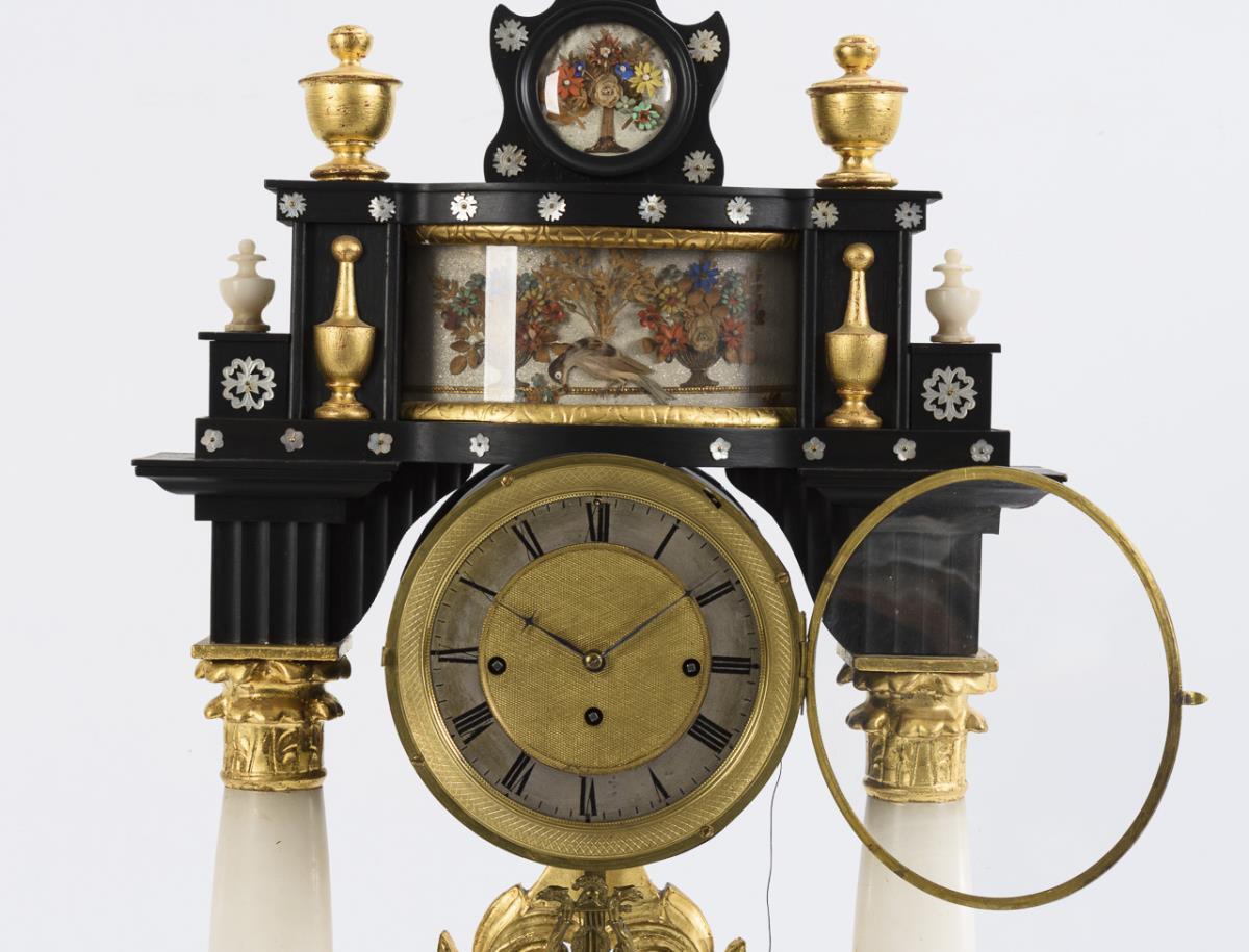 Pillar clock made in Biedermier style with front profiled base, rocaille carvings and high entablature with integrated display cases with paper flowers and a bird. Restored, with additions, probably using old and new parts.