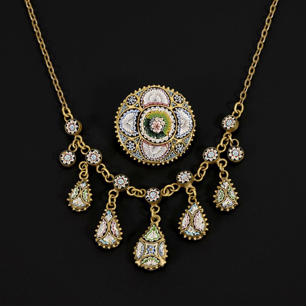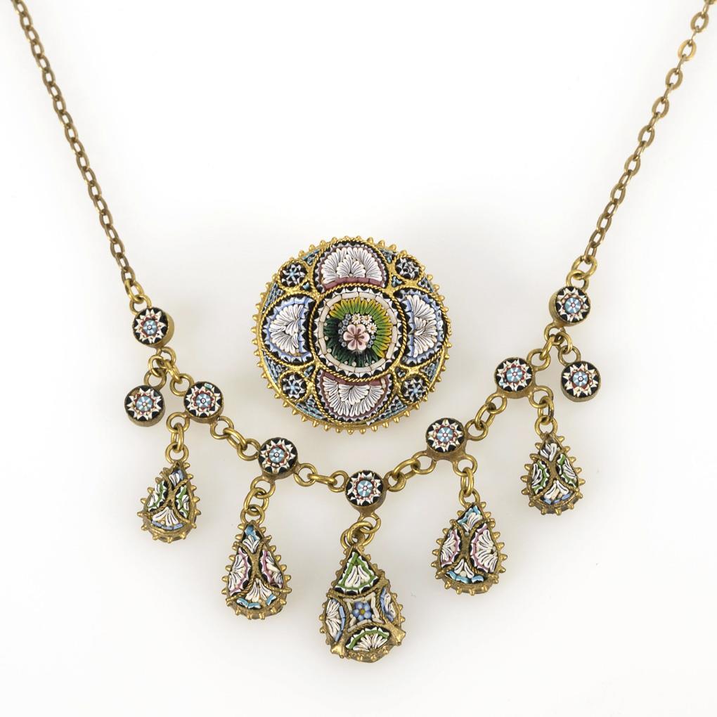Matching brooch with ball hook. 1 small stone in brooch missing. Ball hook supplemented.