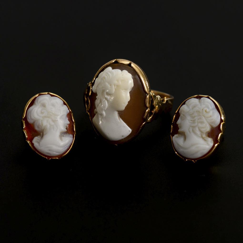 Ring and stud earrings pair with shell cameos.