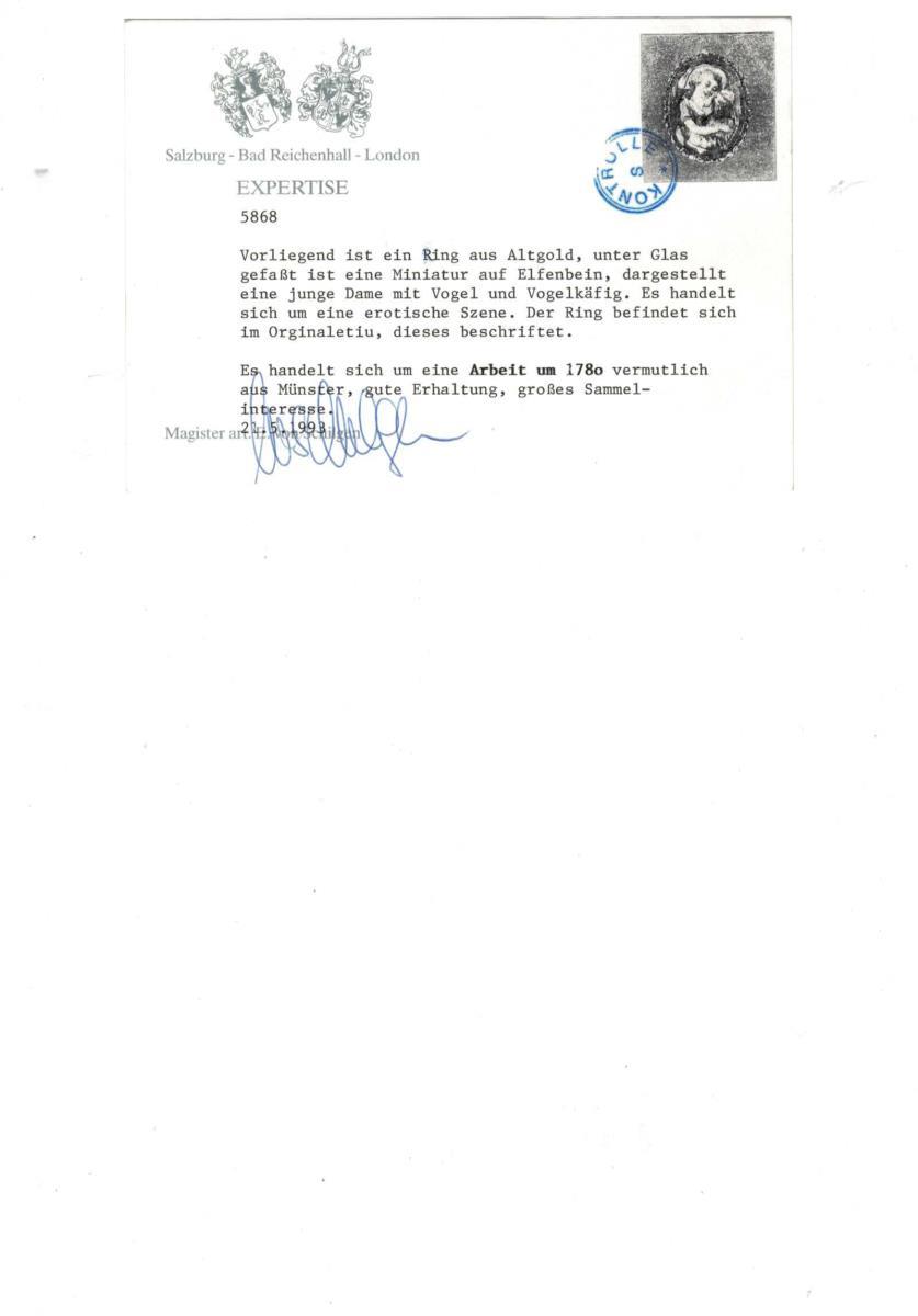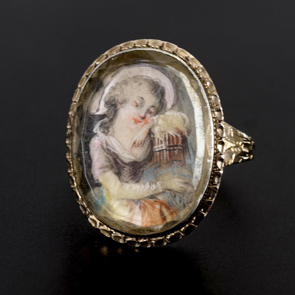 Painted miniature of a girl with birdcage, in closed bezel setting under rim-faced glass cover. Narrow rail.