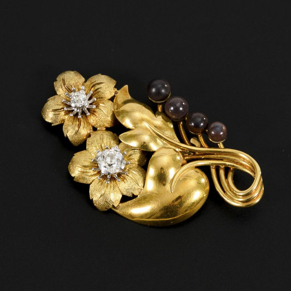 2-flower brooch with 2 chaton-set old-cut diamonds and 4 decorative balls. Sliding hook with anti-tilt . Smallest ball with crack.