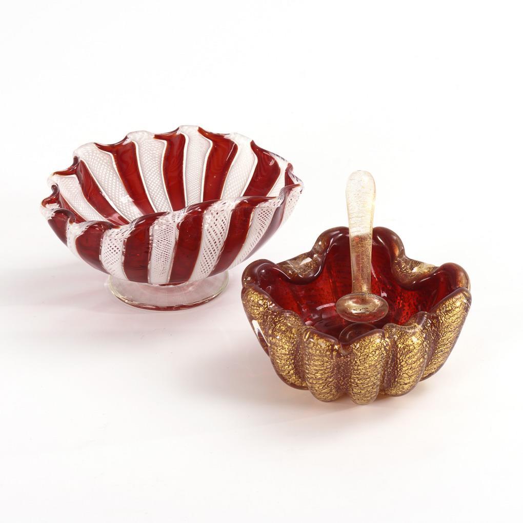 1x footed bowl of colorless glass with streaky fused spiral threads and red glass threads (h 6,5 cm). / 1x ashtray made of colorless glass with red inner catch and melted-in sprinkled gold foil in the interlayer (9 x 9 cm). / 1x Petschaft of colorless glass with gold powder fusion (L 7.5 cm).