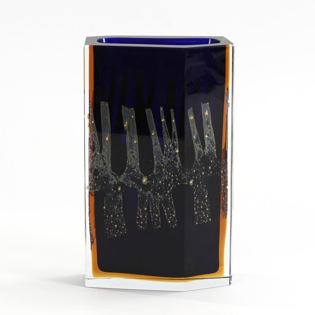 Colorless, thick-walled glass with brown and blue interior and bubbly oxide enamels, cut and polished. H 22,5 cm.