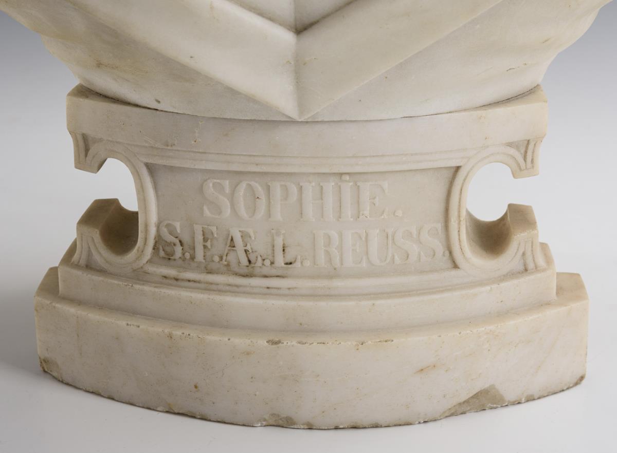 White marble, probably Carrara. On the plinth front "Sophie S.E. AE. L. Reuss" titled, on the base no. "67". H 63 cm. 47,5 kg.