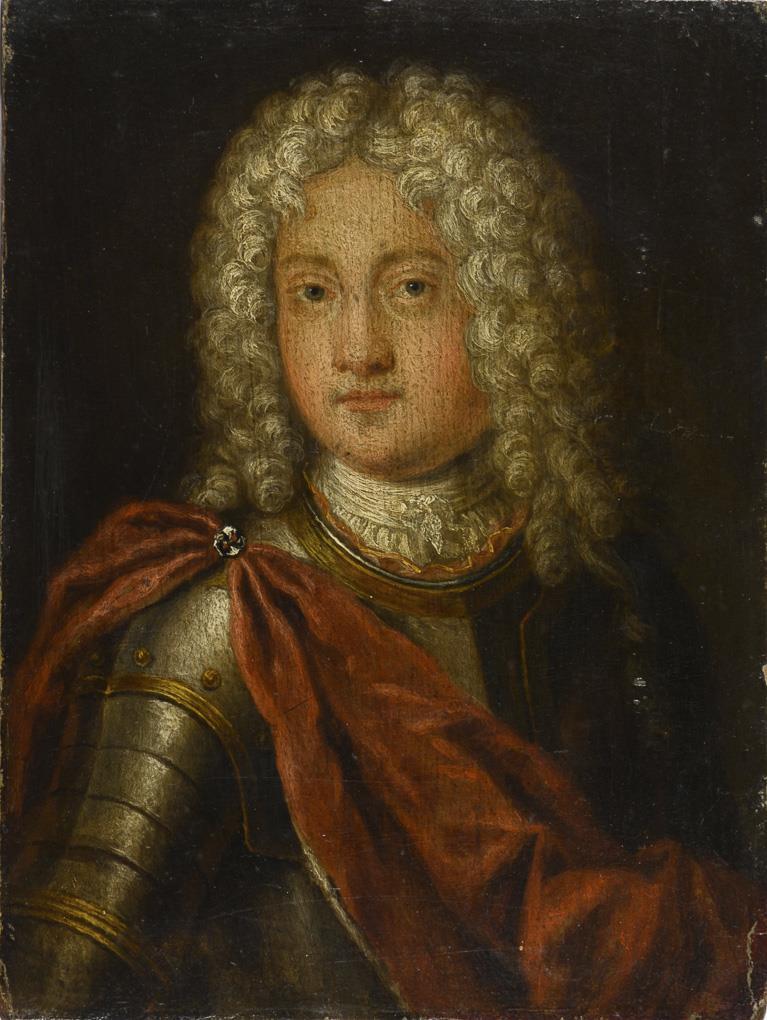Portrait of a young man with curly wig and in armor with red coat. The original from 1704 is in the State Museum Schwerin. Slight traces of age.