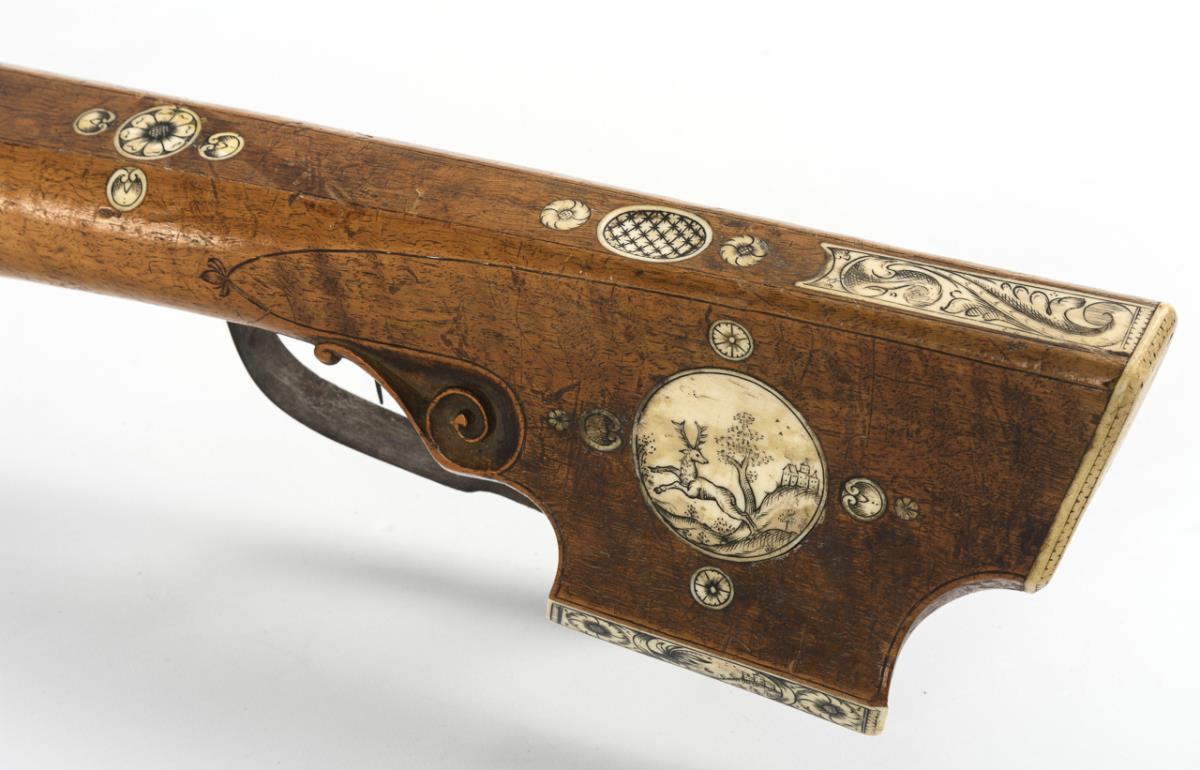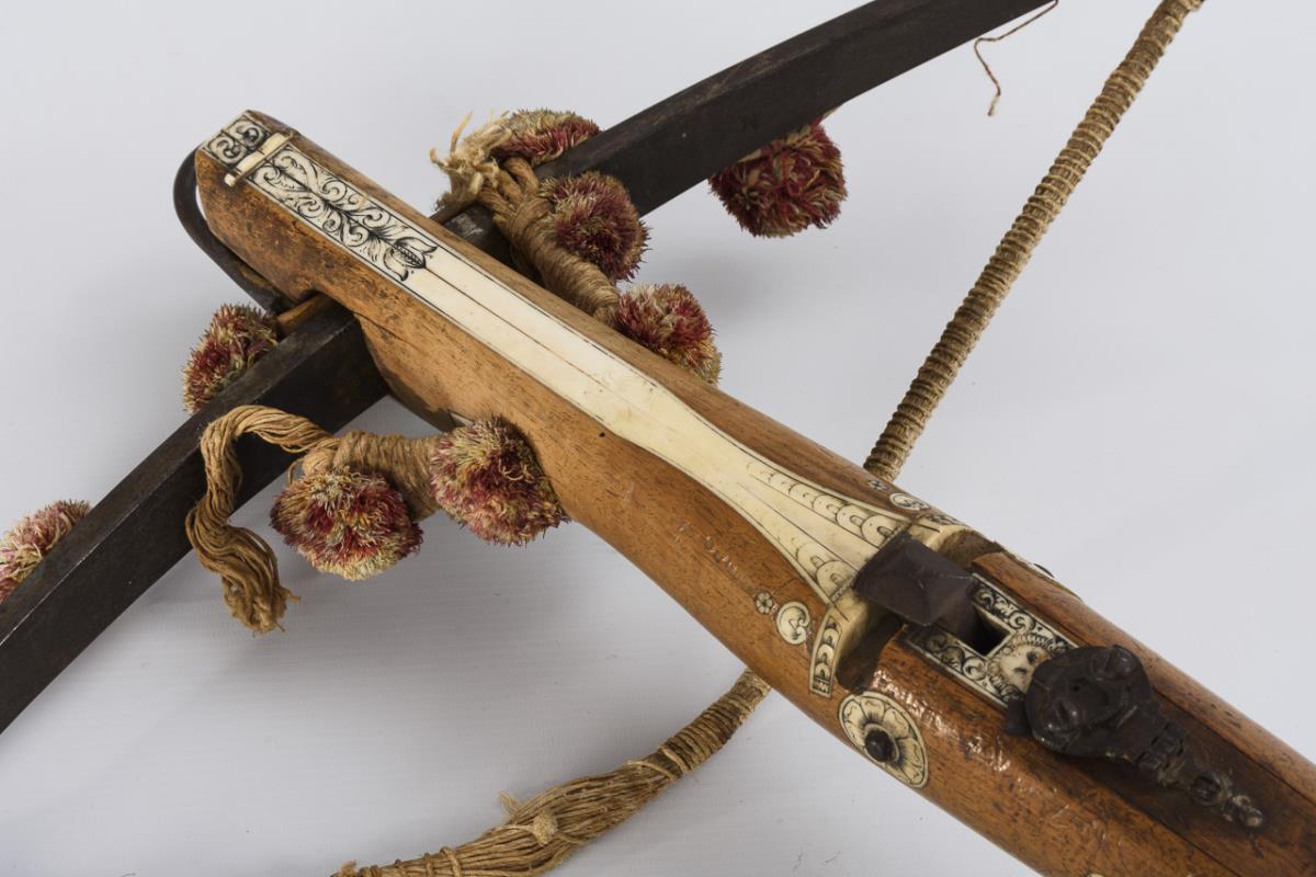 Wooden stock, probably beech, with engraved leg inlays, fine adjustable sights and warped thumb rest on butt. Trigger and set trigger. The bone inlays with floral elements and a jumping stag on the cheek rest. Large dry crack in the tip, string and string holder loose or torn, action sluggish, spring for arrow holder broken off. Otherwise nice original condition.