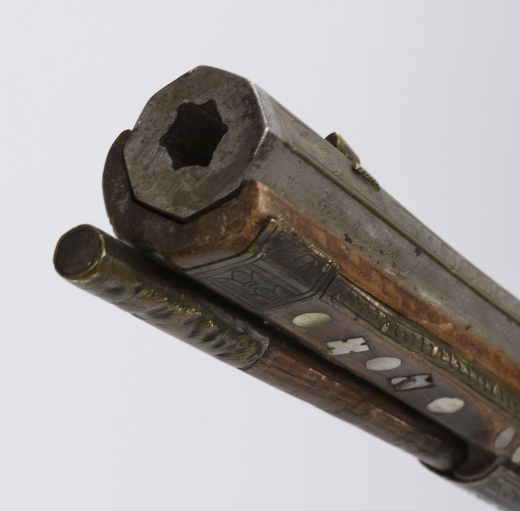 Hunting rifle with six-groove barrel, octagonal on the outside, this triple decorated with engraved brass inlays. Stock richly inlaid with brass, mother-of-pearl, bone and green stone inlays. Rear sight and ramrod present. Good condition and beautiful age patina. Few inlays especially at the butt end missing. Cock loose as the screw is missing. Slider works. Openworked cover of the spring for the cock somewhat bent. Piston chamber jammed.