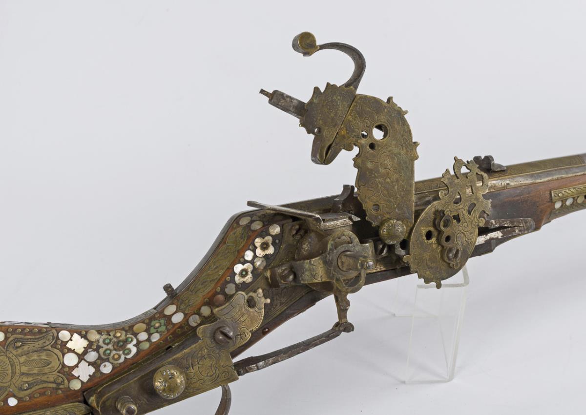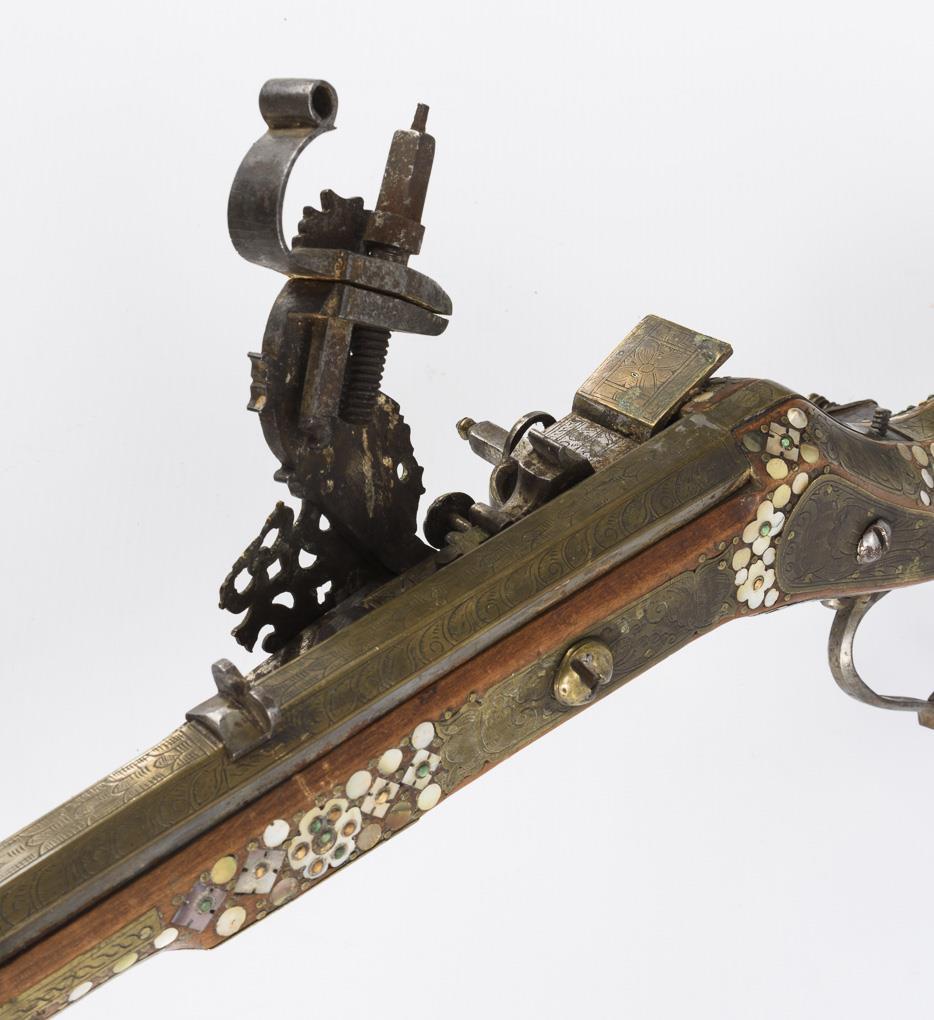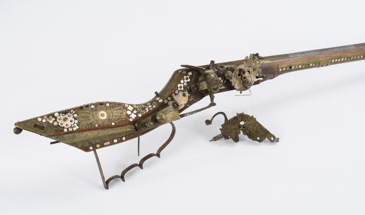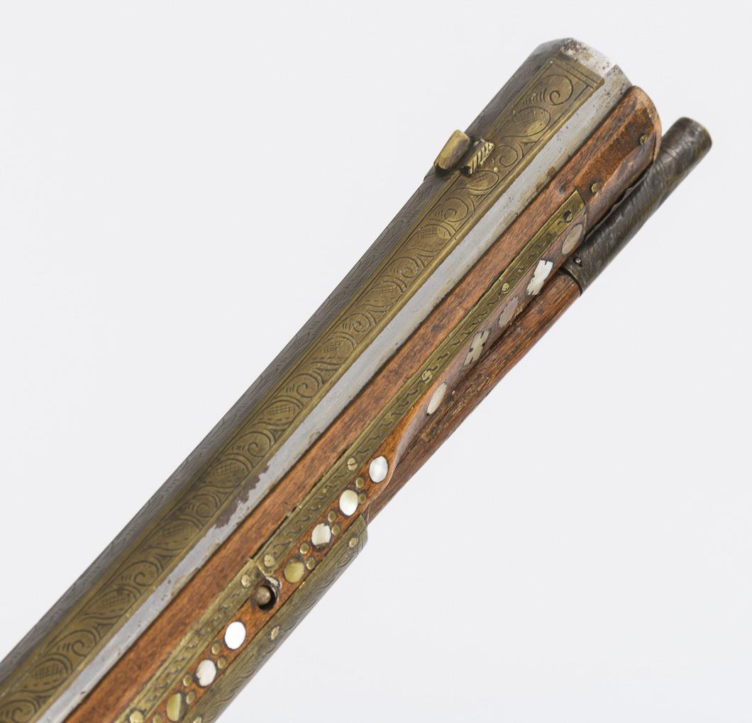 Hunting rifle with six-groove barrel, octagonal on the outside, this triple decorated with engraved brass inlays. Stock richly inlaid with brass, mother-of-pearl, bone and green stone inlays. Rear sight and ramrod present. Good condition and beautiful age patina. Few inlays especially at the butt end missing. Cock loose as the screw is missing. Slider works. Openworked cover of the spring for the cock somewhat bent. Piston chamber jammed.