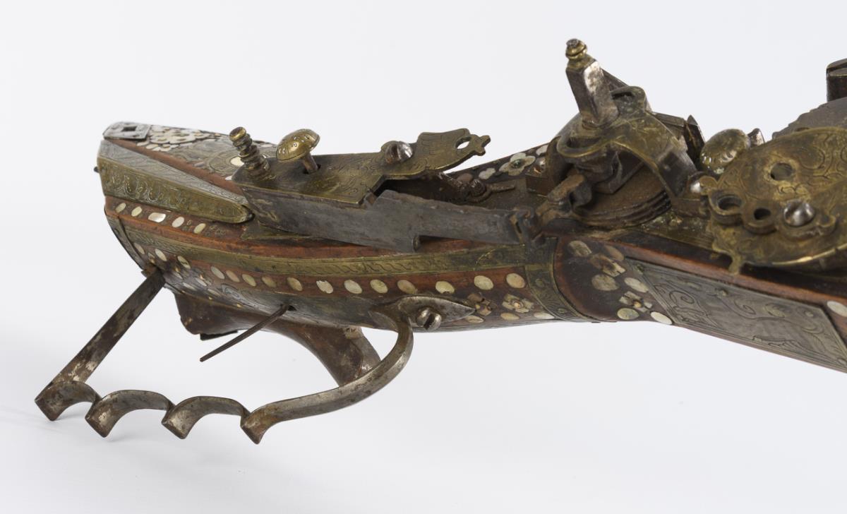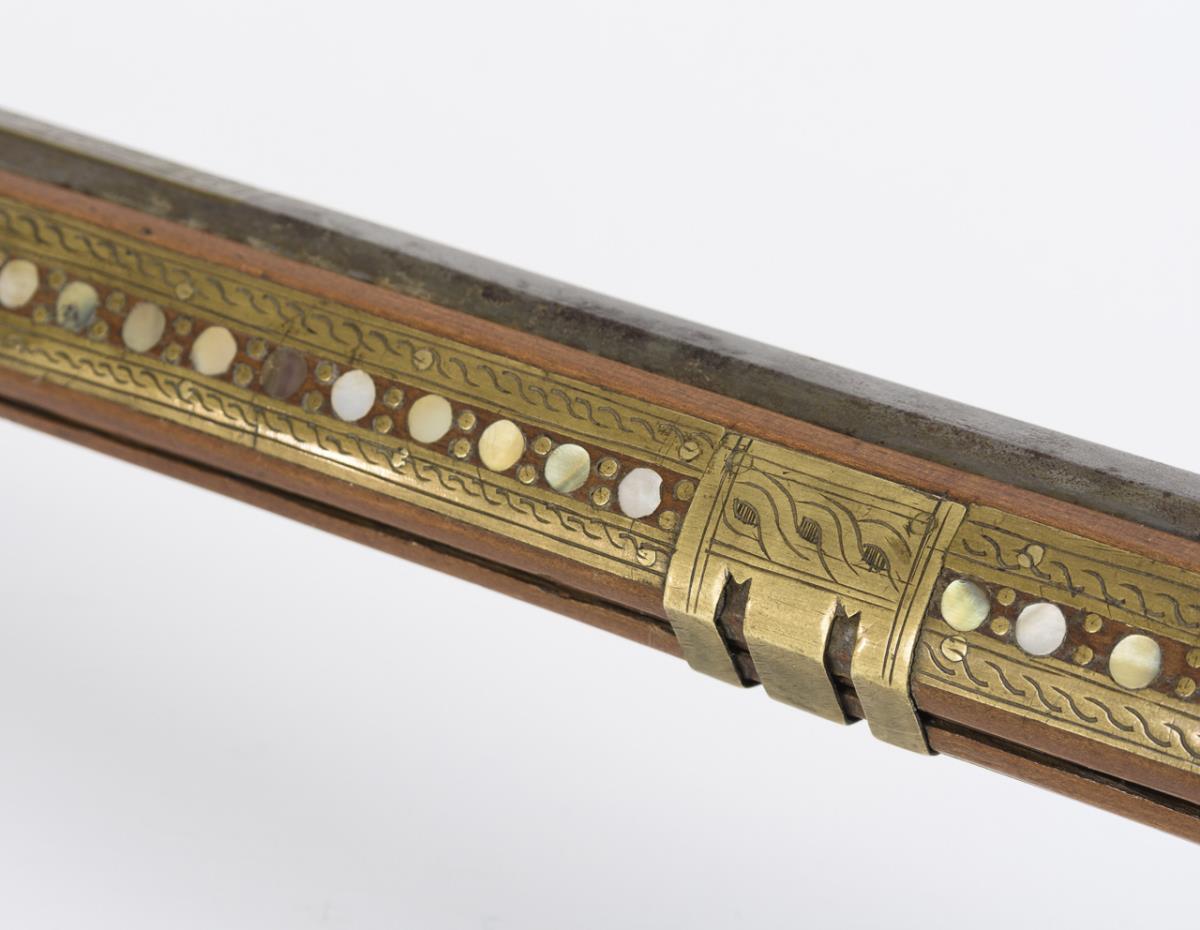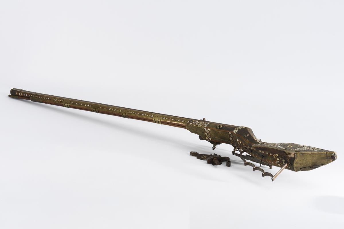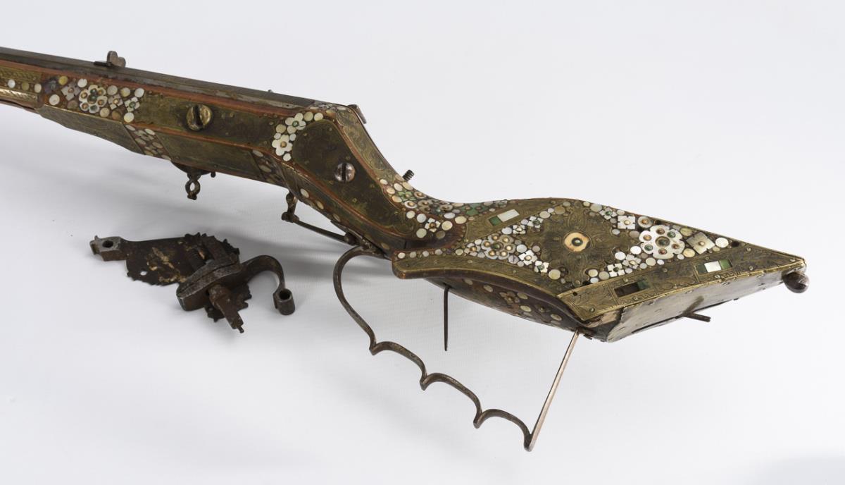 Hunting rifle with six-groove barrel, octagonal on the outside, this triple decorated with engraved brass inlays. Stock richly inlaid with brass, mother-of-pearl, bone and green stone inlays. Rear sight and ramrod present. Good condition and beautiful age patina. Few inlays especially at the butt end missing. Cock loose as the screw is missing. Slider works. Openworked cover of the spring for the cock somewhat bent. Piston chamber jammed.