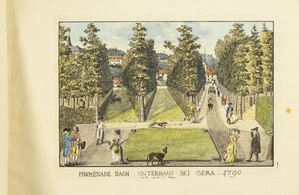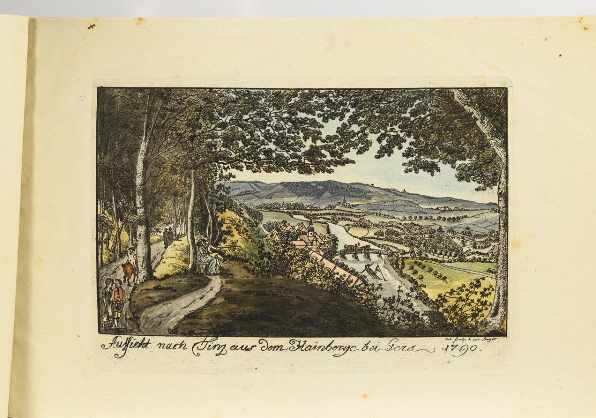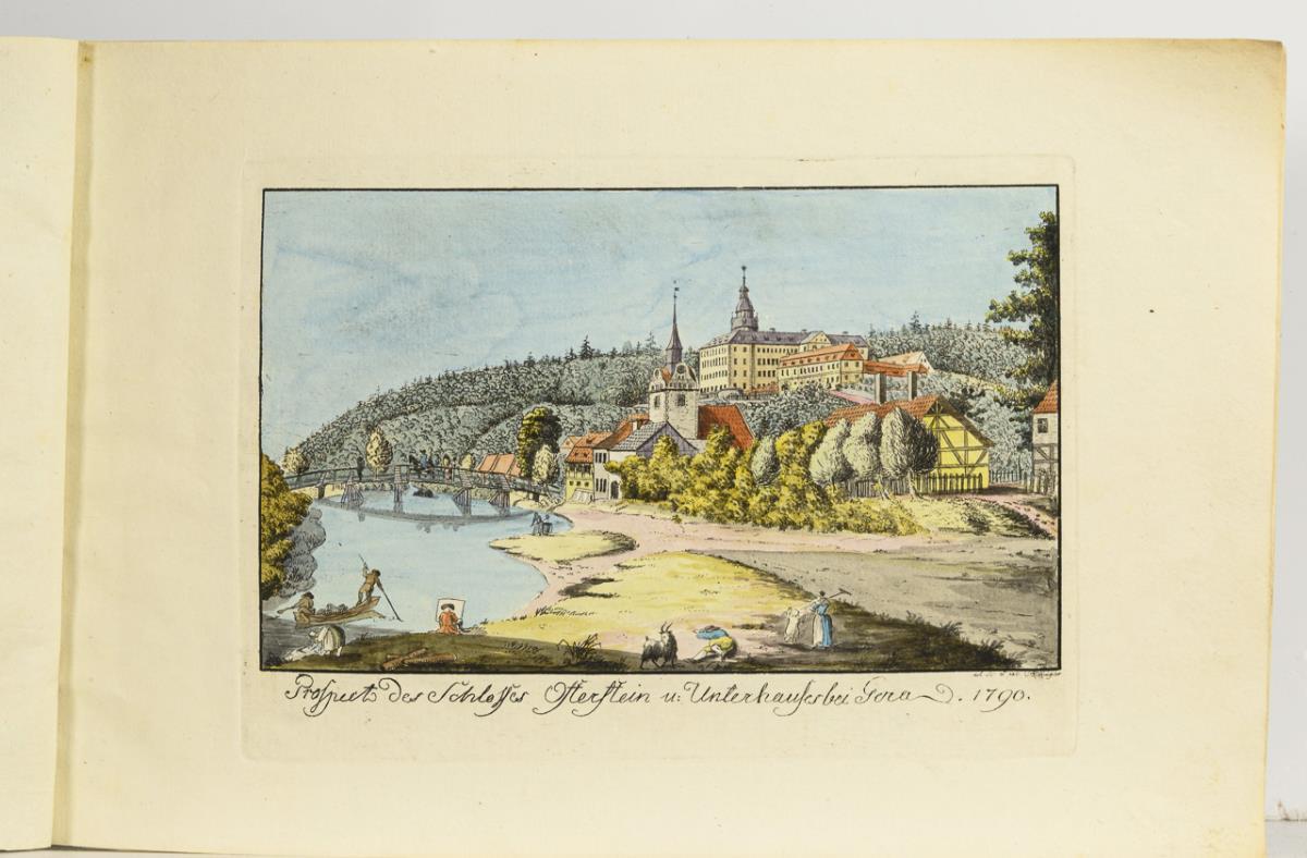 Bound booklet with 5 colored copperplate engravings "Ansicht von Gera.1790", "Prospect des Schlosses Osterstein u. Unterhauses bei Gera. 1790", "Promenade to Unterhaus near Gera. 1790", "View to Tinz from the Hainberge near Gera. 1790" and "Lustschloss= und Dorf Tinz an der Landstrasse von Gera nach Zeitz."; original booklet with paper label and handwritten title "Ansichten von Gera und Umgebung. VI pieces", "No. 41", plus note "1 piece taken, framed [...] hung". Booklet grip-marked, leaves slightly foxed.