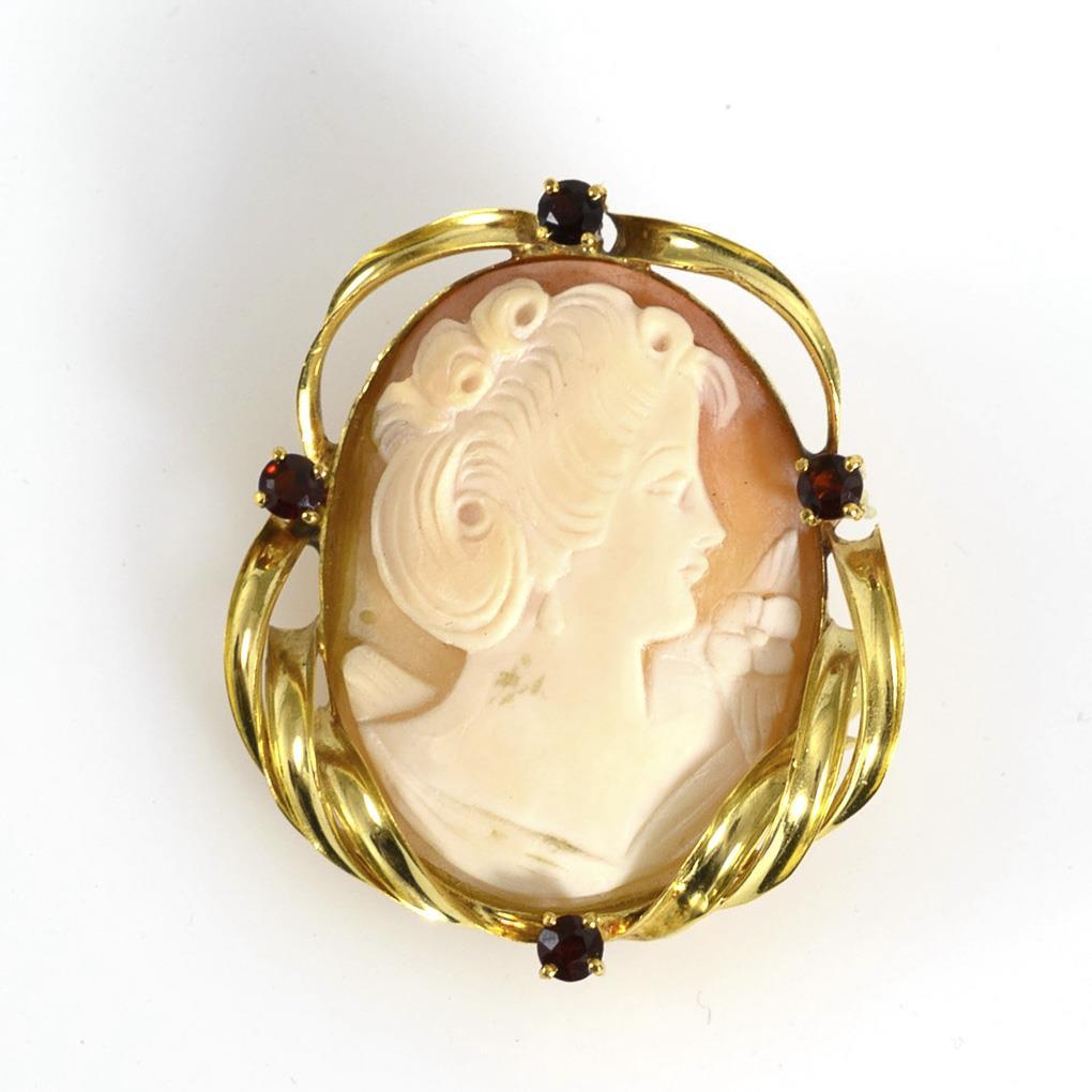 Cut cameo with girl profile head in frame setting, with 4 chaton set garnets in decorative frames. Sliding hook.