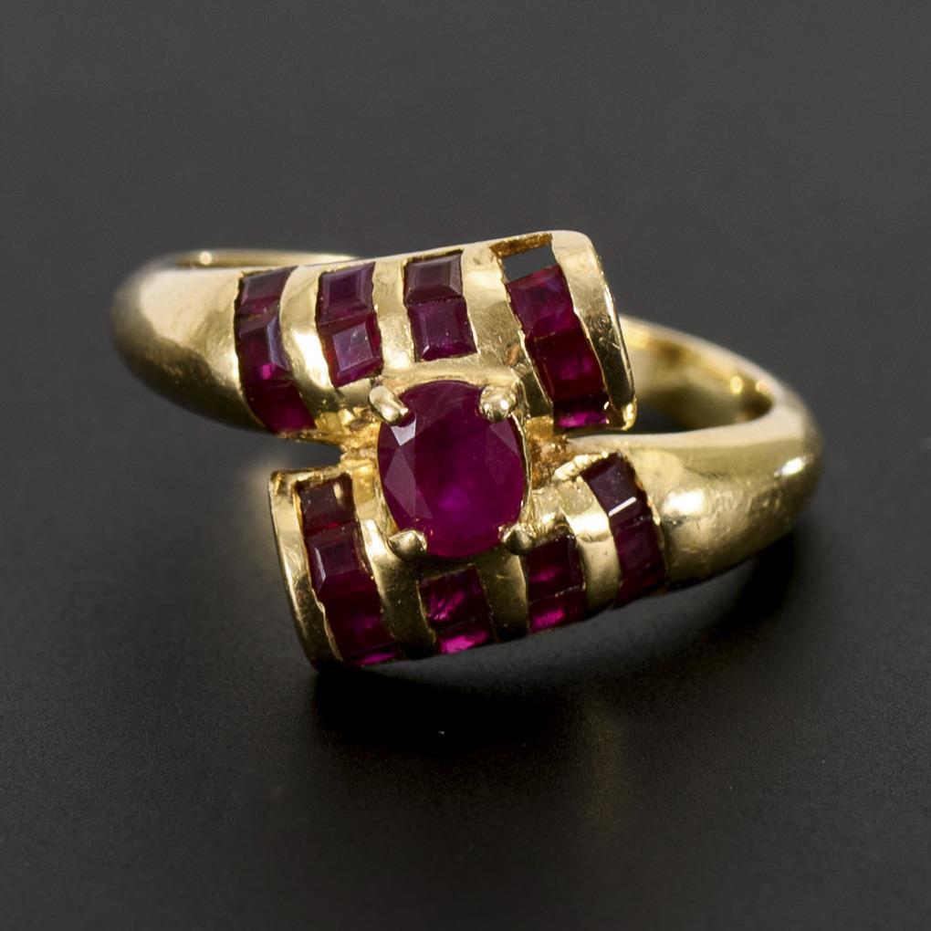 Claw-set ruby surrounded by 20 inset ruby garlands between narrow rail. 1 ruby garland missing.