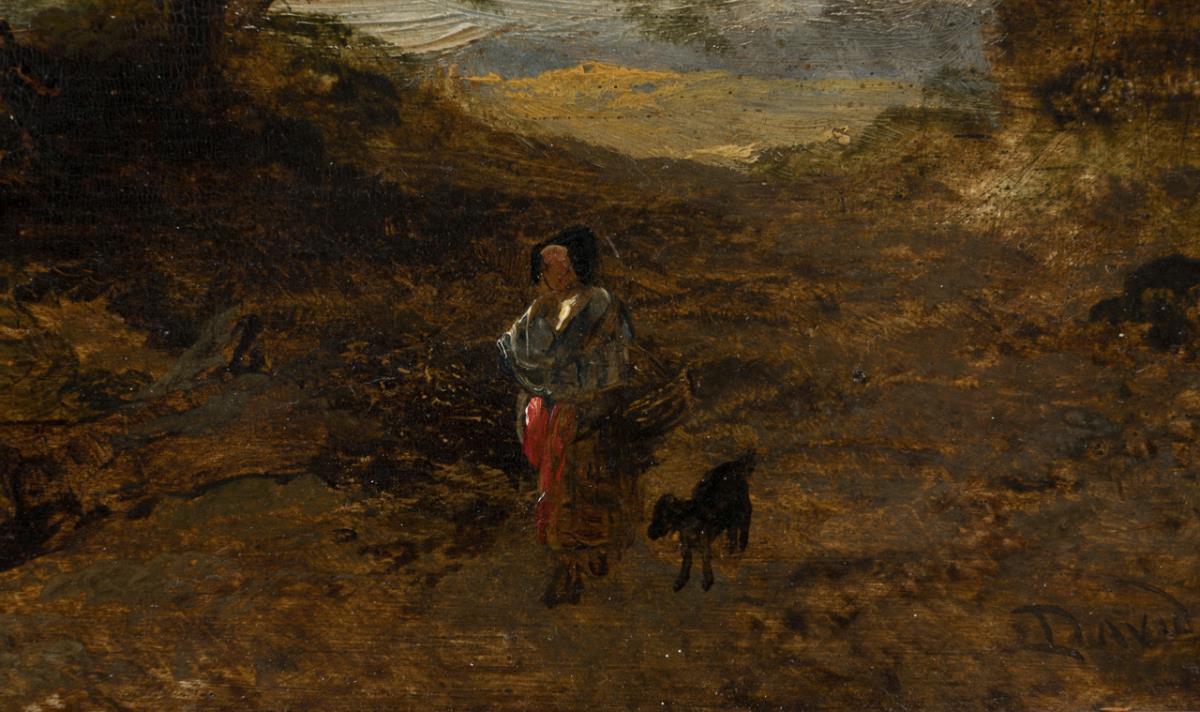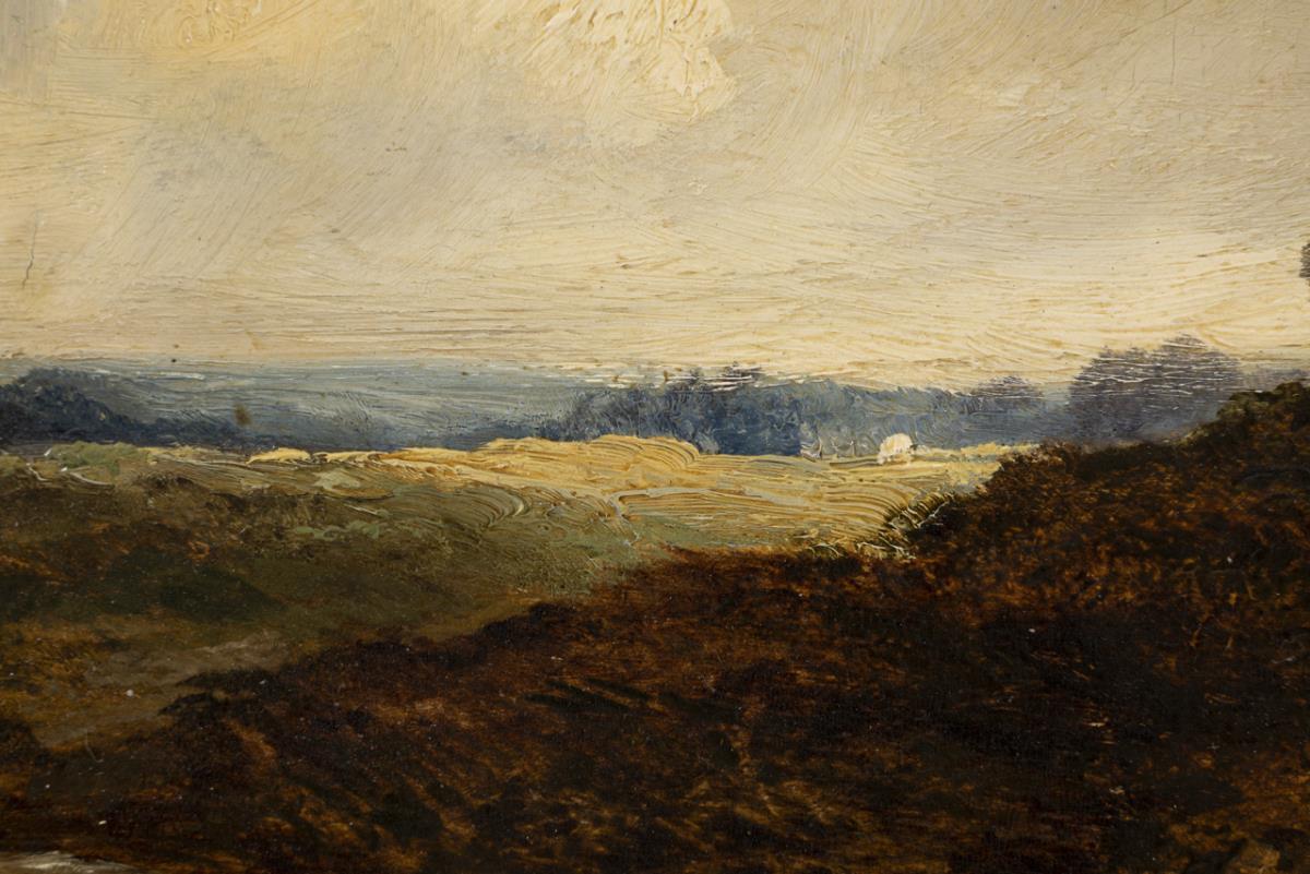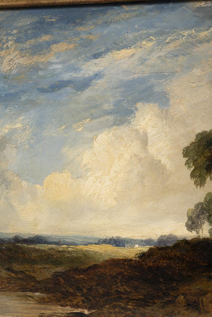 Staffage figures in wide landscape under moving cloudy sky. Restored crack with wooden reinforcements on the back.