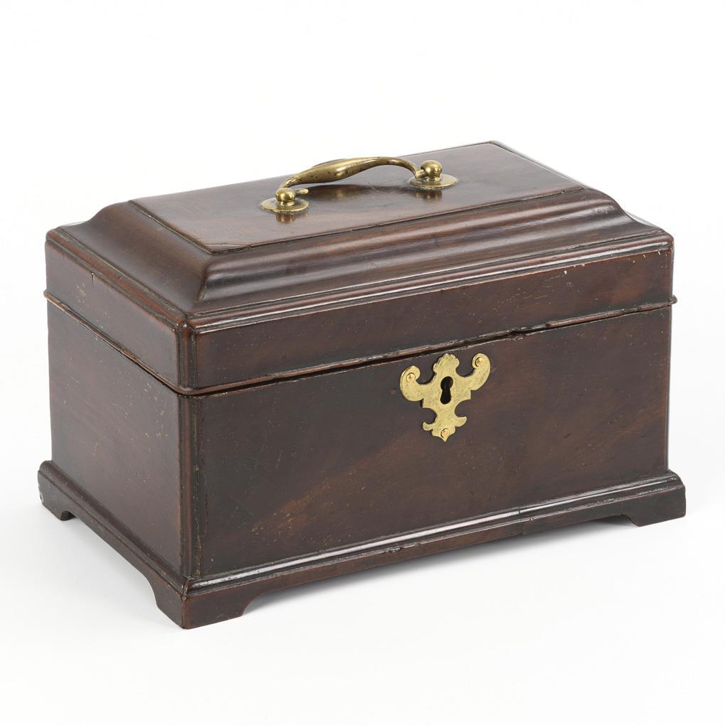 Highly crafted tea caddy with feet sawn out of the baseboard, indented rounded edges on all sides, profiled hinged lid and hinged carrying handle, and ornamental keyhole panel in the front. Also inside veneered casket with green velvet cover in the lid and partition for the compartment. Restored, some minor additions, 2 missing partitions, removed secret compartment.