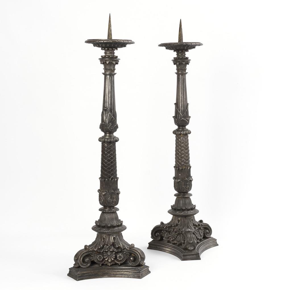 Candlestick with foliate volute feet on 3-sided plinth, stepped palm-like shaft with leaf trim and wax plate with square spike. Remains of a gold bronzing.