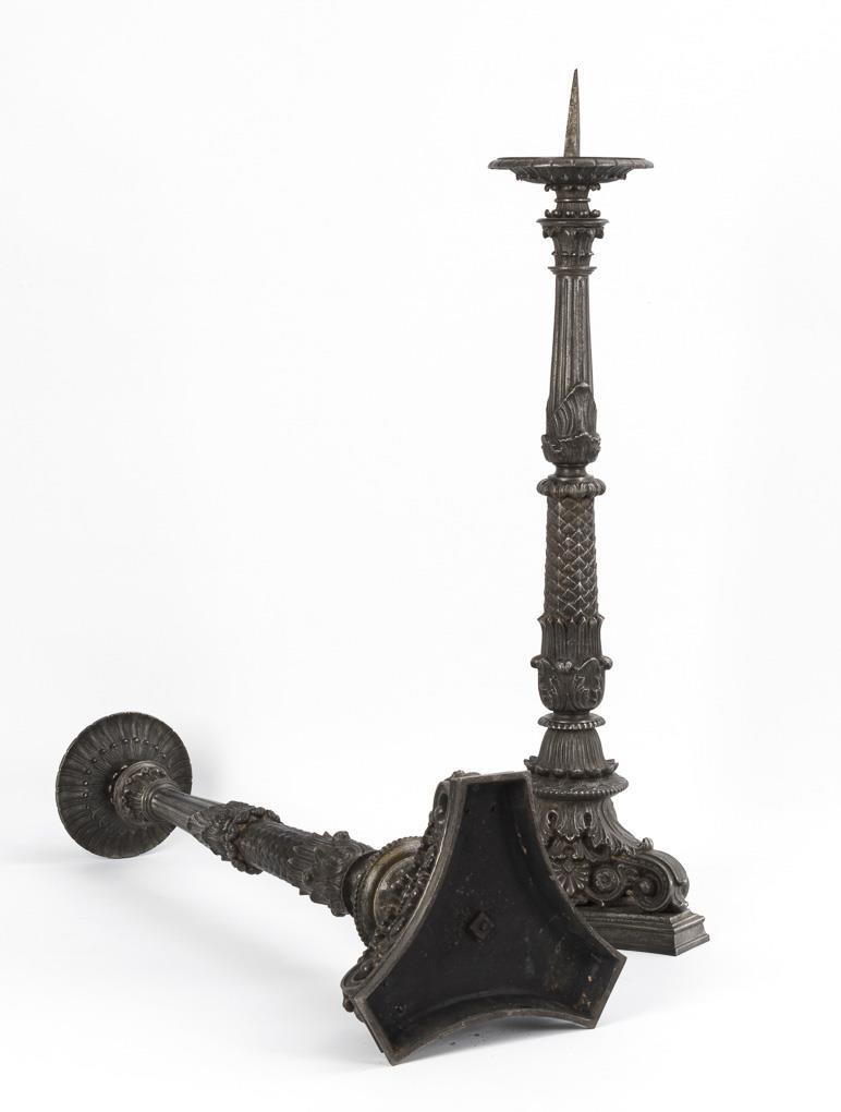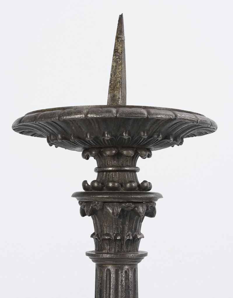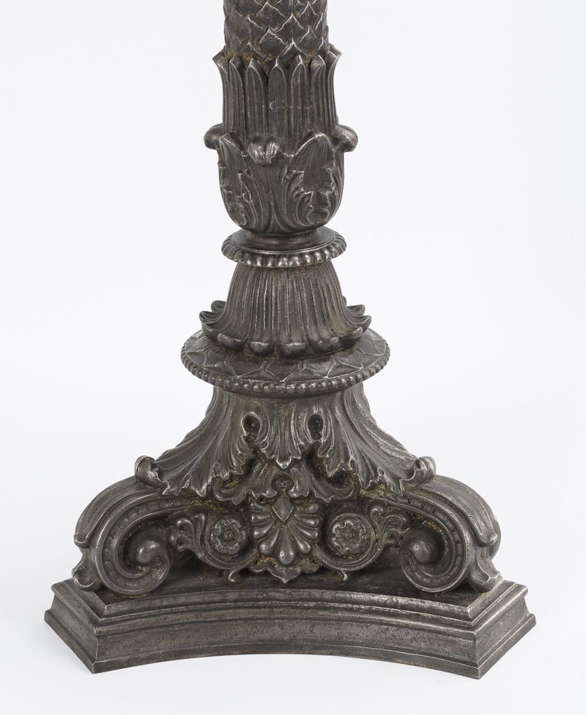 Candlestick with foliate volute feet on 3-sided plinth, stepped palm-like shaft with leaf trim and wax plate with square spike. Remains of a gold bronzing.