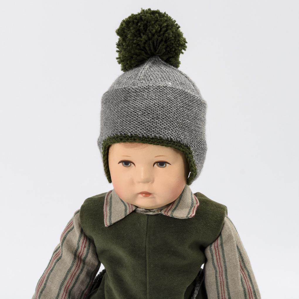 Original dressed boy with green velvet pants, striped shirt, knitted cap and green shoes. Unplayed exhibit. At the back of the head 2 paint scratches.