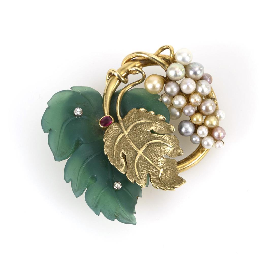 Bunch of grapes brooch with green agate?, pearls and diamonds.