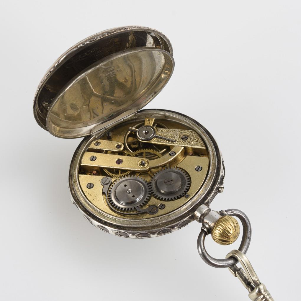 800 hallmarked, Swiss hallmark. Clock Ø 4,7 cm, 74 g. Chain L 28,5 cm.