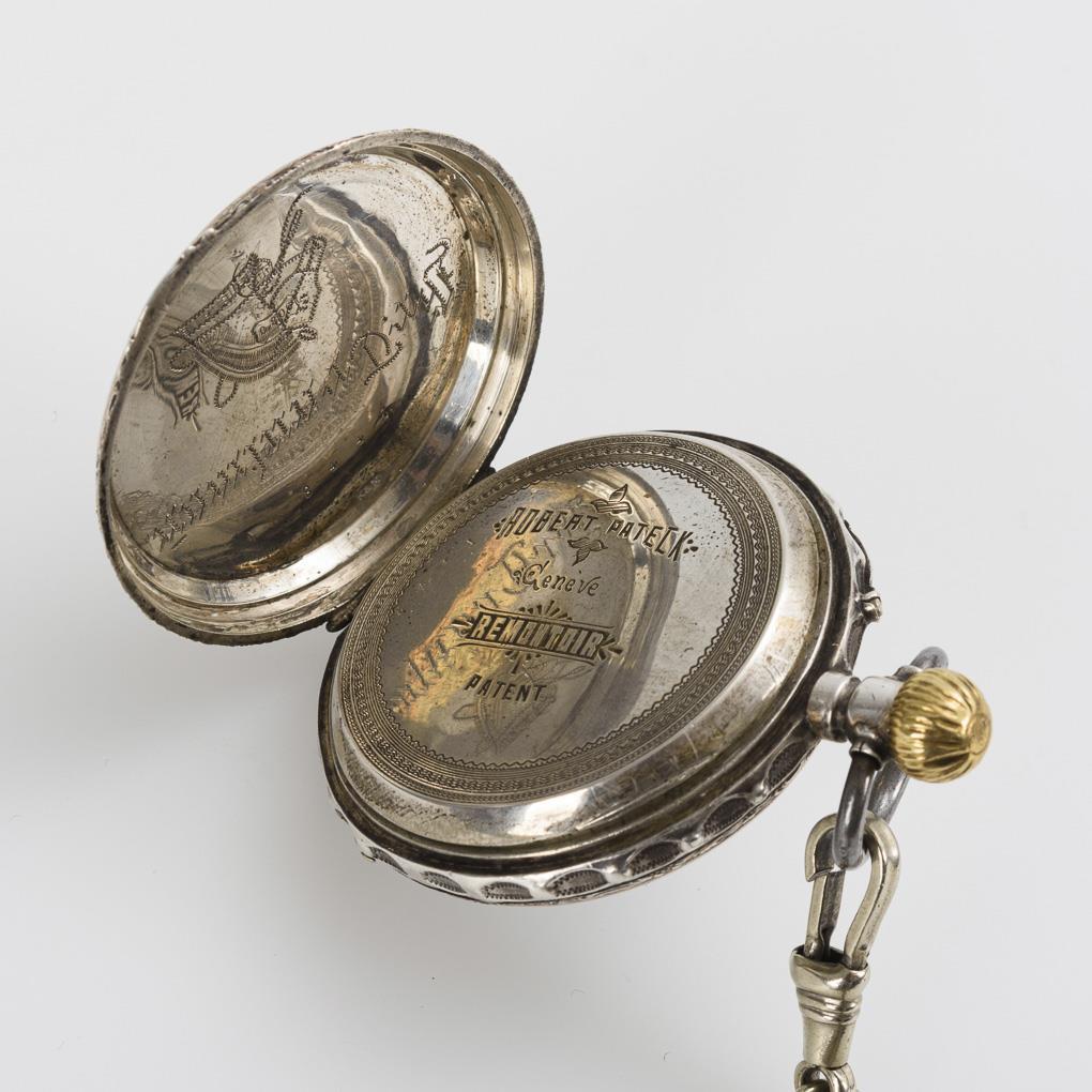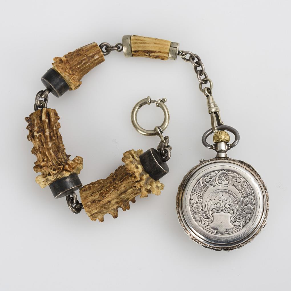Floral relief lépine case with blank coat of arms cartouche and personalized engravings inside, marked "Robert Pateck". On metal link chain with antler pieces in the course.