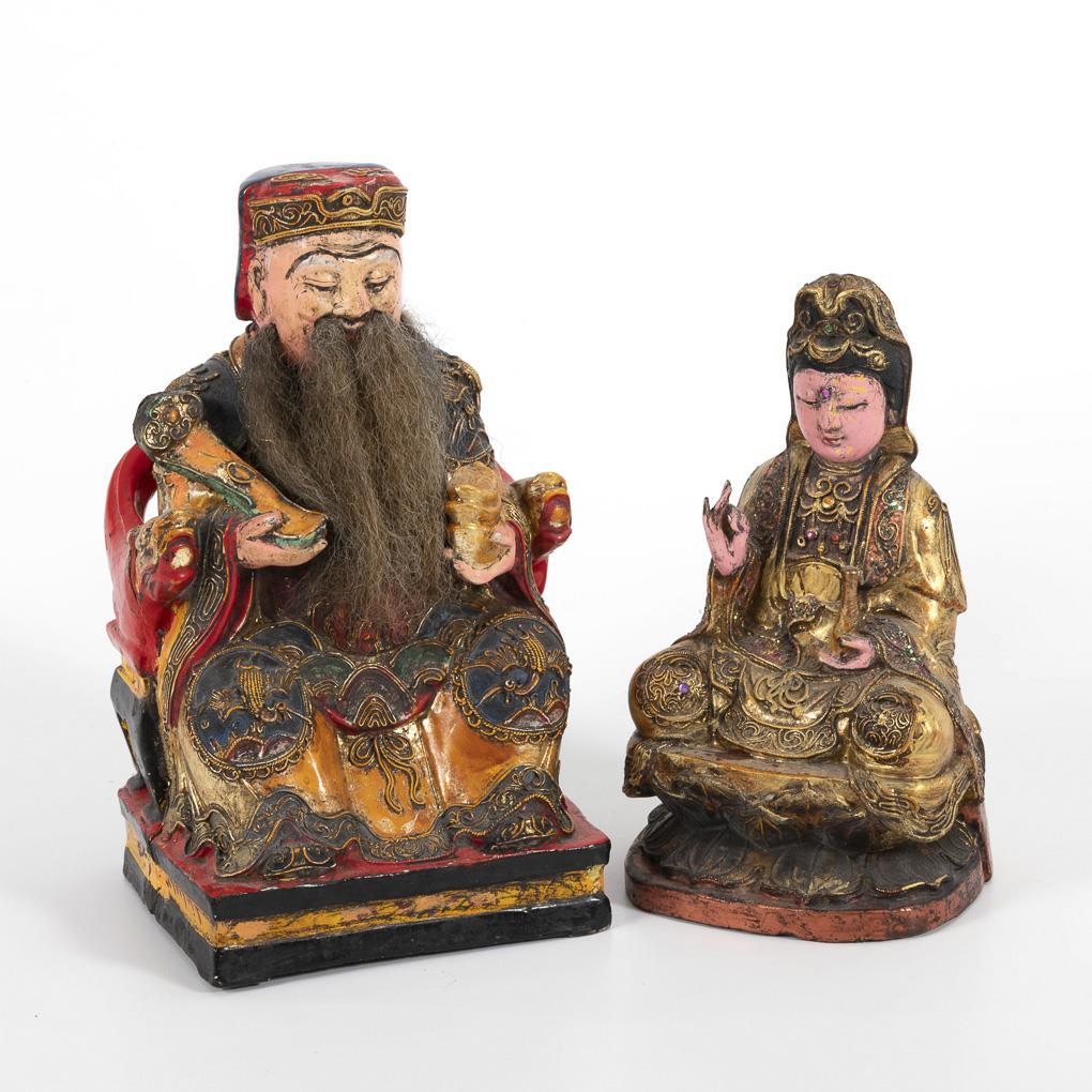 Guanyin with a vessel in his hand, resting on double lotus throne, in gold-colored clothing with stone trim. / Bearded man with Ruji scepter and sycee bar, sitting on a throne. Marks of use consistent with age.