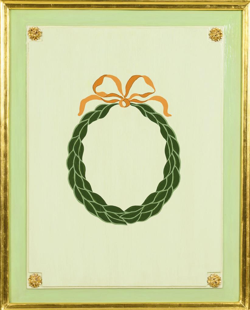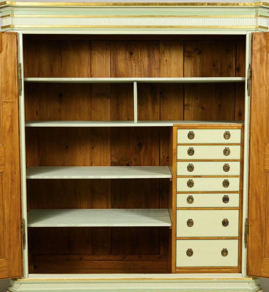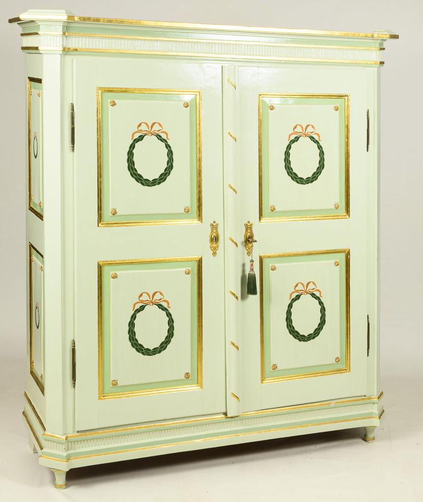 Large 2-door hall cabinet with stepped cornice and coffered doors and sides, mint green set and accented in gold, decorated with painted laurel wreaths with bows and antiquing bronze applications; inside compartment system with 6 different sized compartments and 7 drawers. Restored ready for living, minimal signs of age / use, frame minimally rubbed.