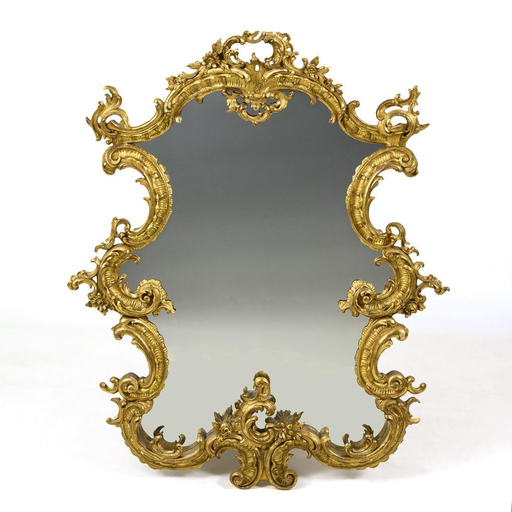 Pompous wall mirror in style-typical curved shape with rocaille decorated stucco frame. Traces of age/use, frame with small bumps, mirror glass renewed.