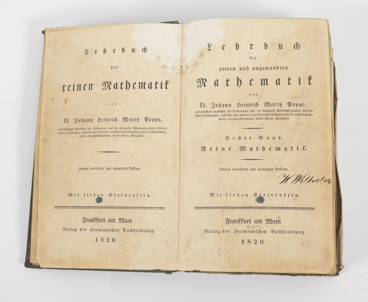 Hegenberg, F.A.: "Vollständiges Lehrbuch der reinen Elementar-Mathematik" Volumes 1 and 4, Berlin 1821 and 1825, by T.Ch.F. Enslin. "Arithmetic and Lower Algebra," 488 pages, and "Plane and Spherical Trigonometry and Polygonometry.... nebst Supplement zu den ersten drei Theilen", 697 pages as well as 2 of 4 plates. / Poppe, H.H.M.: "Lehrbuch der reinen und angewandten Mathematik", first volume - pure mathematics, Frankfurt/M 1920, Verlag der Hermannschen Buchhandlung, 468 pages and 7 plates. Signs of age and wear, once with pencil scribbles, one spine defective, one volume somewhat stained.