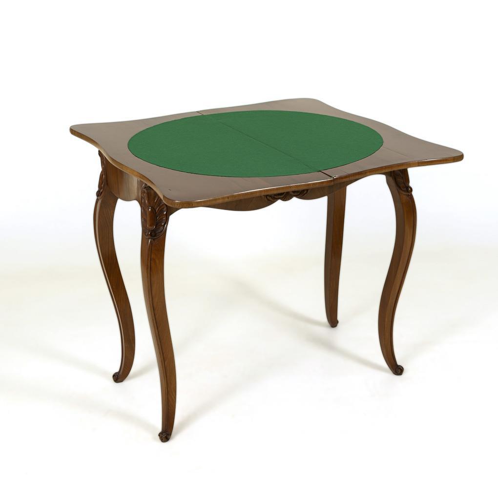 Game and console table in style-typical curved form with rotating and hinged top plate on frame box; game board with green velvet cover, frame box lined with green velvet inside; decorated with shell work. Signs of age/use, veneer with drying cracks.