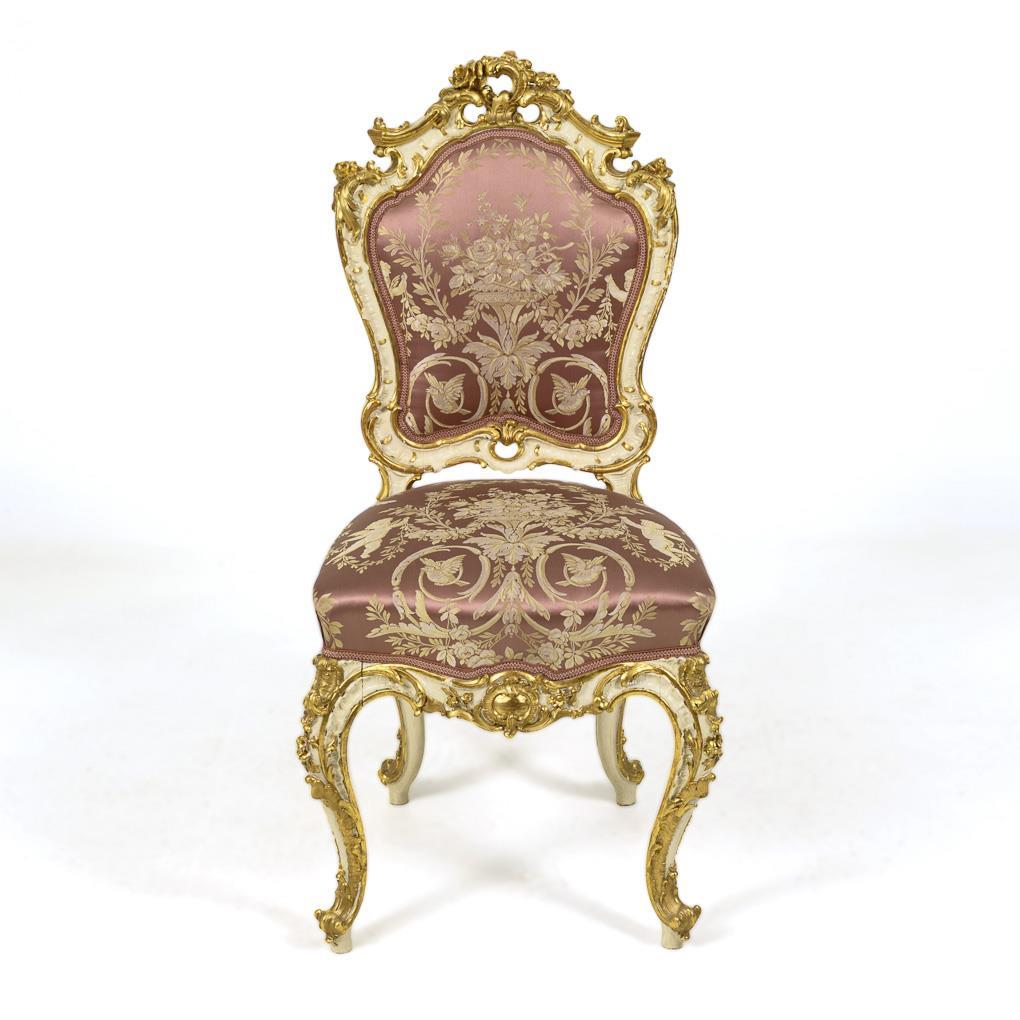 White- and gold-framed upholstered chair in style-typical curved design, decorated with lush rocaille carving; rose-colored cover with floral bouquets and putti. Traces of age/use, frame partly rubbed, stucco with small defects.