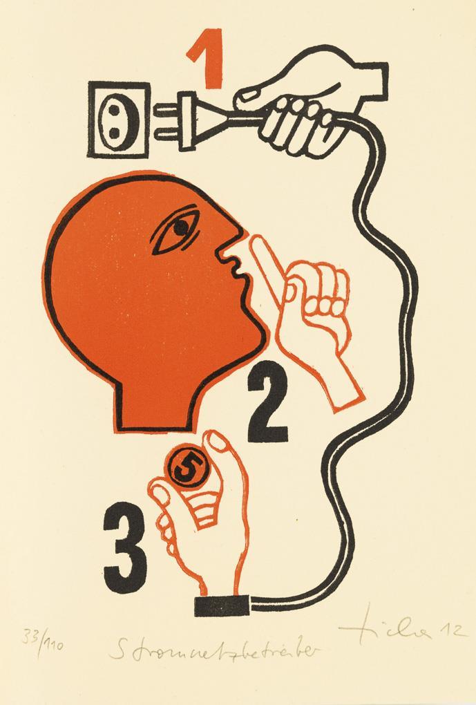 Ticha, Hans: "Stromnetzbetreiber", color silkscreen, pencil signature, copy: 33/100, [20]12, sheet: 29 x 20 cm | Ticha, Hans: "Zu Brecht Flüchtlingsgespräch", woodcut, pencil signature, [19]97, sheet: 22 x15,1 cm | Thiele, Peter: "Mann mit Mond", color offset print, pencil signature, 2016, copy: 83/100, sheet: 29,8 x 21 cm.