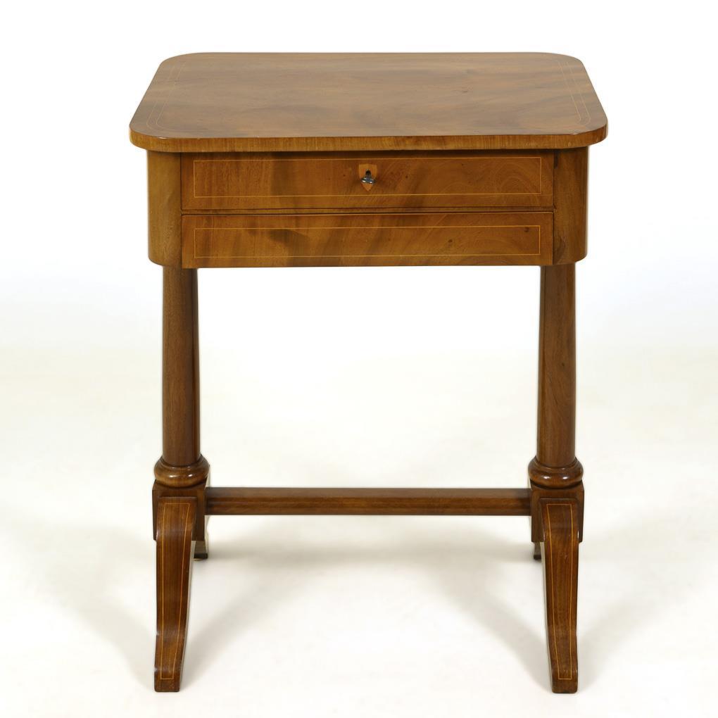 Simple rectangular sewing table on 2 columnar legs, with bridge feet and foot bracing, discreetly decorated with fine ribbon inlays; 2 drawers, 1 of which lockable and inside with compartment for sewing utensils, 2 compartments with lids. Traces of age/use, veneer with small additions.