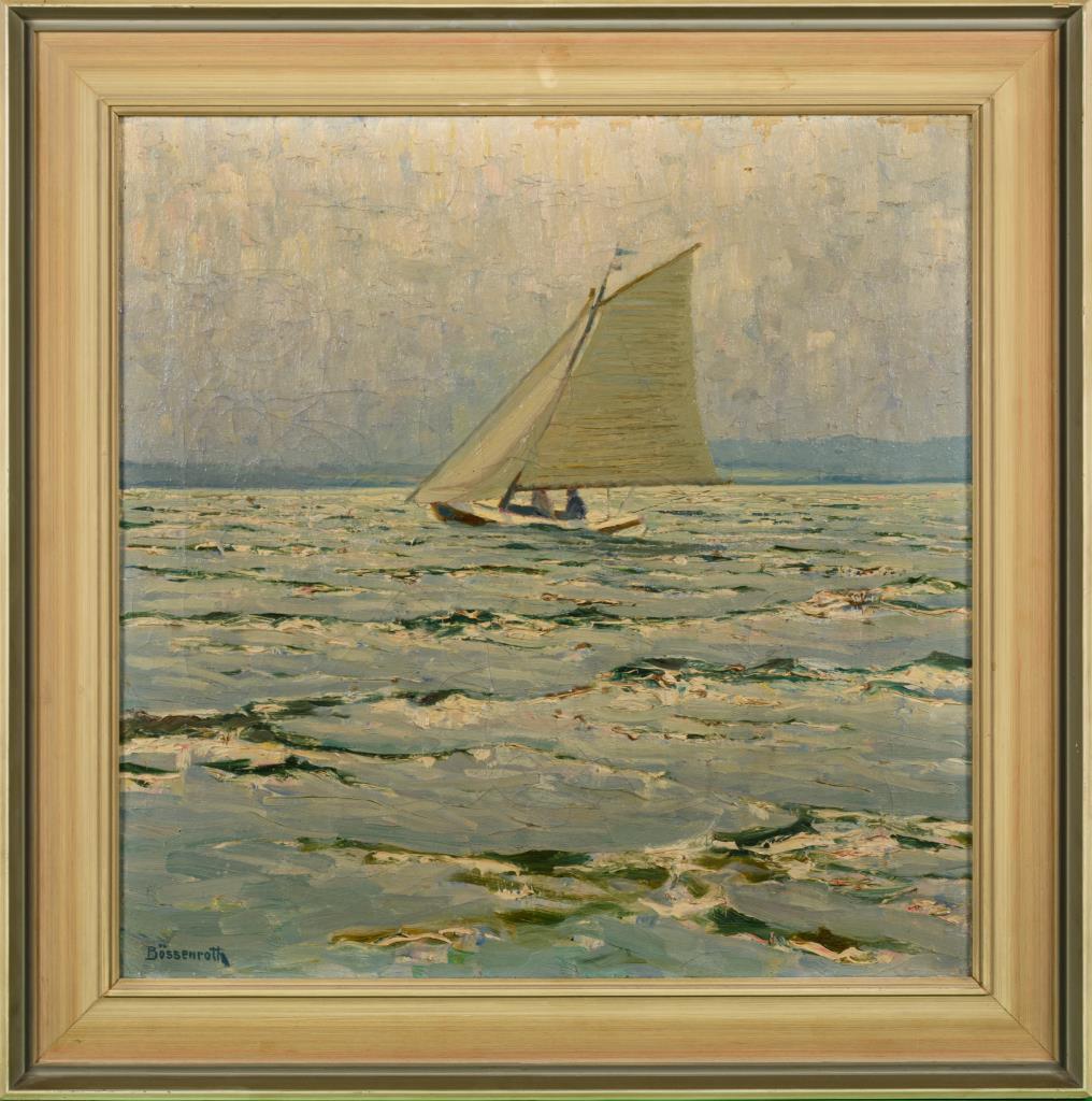 Segler mit zwei Personen im Sonnenschein auf dem Wasser nahe der Küste. Minimale Altersspuren.