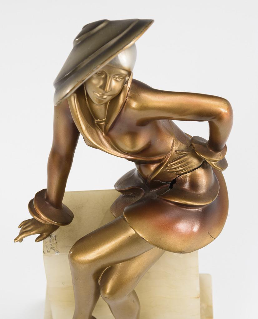Lasciviously on the base sitting young woman in a short sheath dress as well as with jaunty hat.