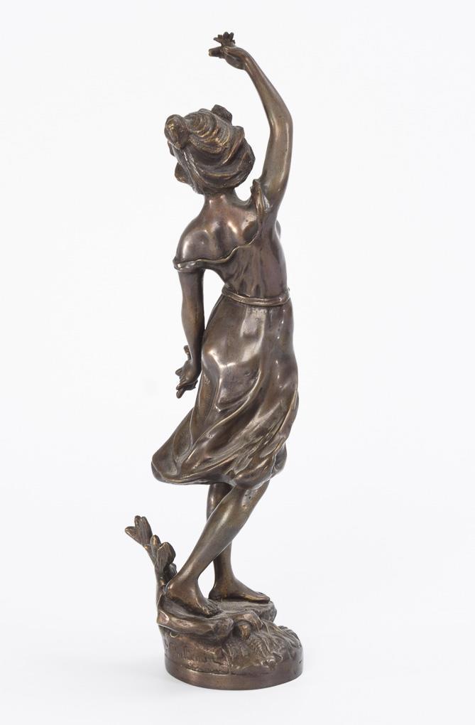 On naturalistic base striding young woman; probably allegory of spring.