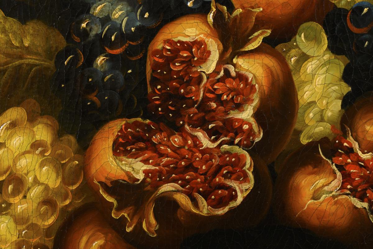Grapes, pears and peaches in a porcelain bowl on a ledge above other grapes, pumpkins and pomegranates. Traces of age.
