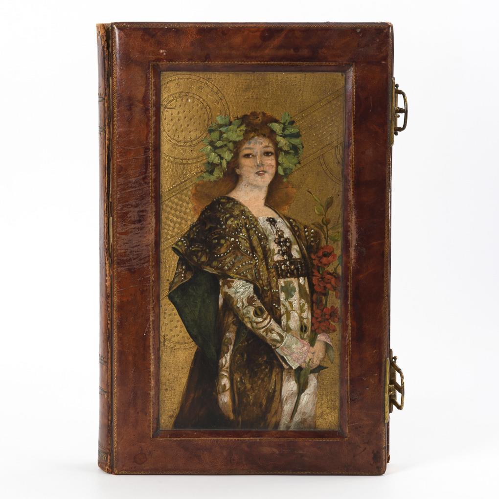 Leather binding with gold embossing on the spine, gilt edges as well as brass clasps. On the cover knee piece of a wreathed woman with red flower. 14 cardboard pages with photo cutouts of various sizes (Cdv to Boudoir, 1x full size). On the endpaper painted connection coat of arms. 1 cover joint torn, page covers more often torn, traces of glue, strong signs of age / wear.